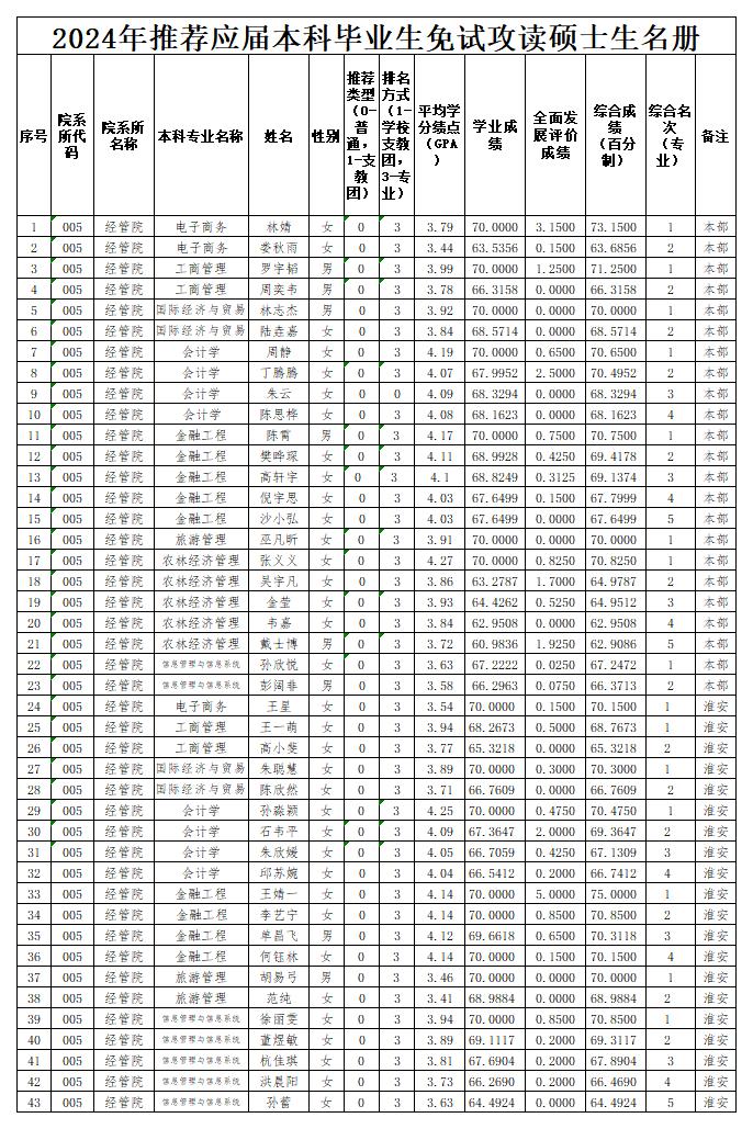 根据《南京林业大学关于做好2024年推荐优秀应届本科毕业生免试攻读研究生工作的通知》和《经济管理学院推荐2024年优秀应届本科生免试攻读硕士研究生工作实施细则》,经学生申请,学院推免生遴选工作领导小组资格审核,确认林婧等43名同学获得经济管理学院推免资格,现将名单予以公示。公示时间为2023年9月21日至9月27日。公示期间,如有异议,可署名向学院反映情况。