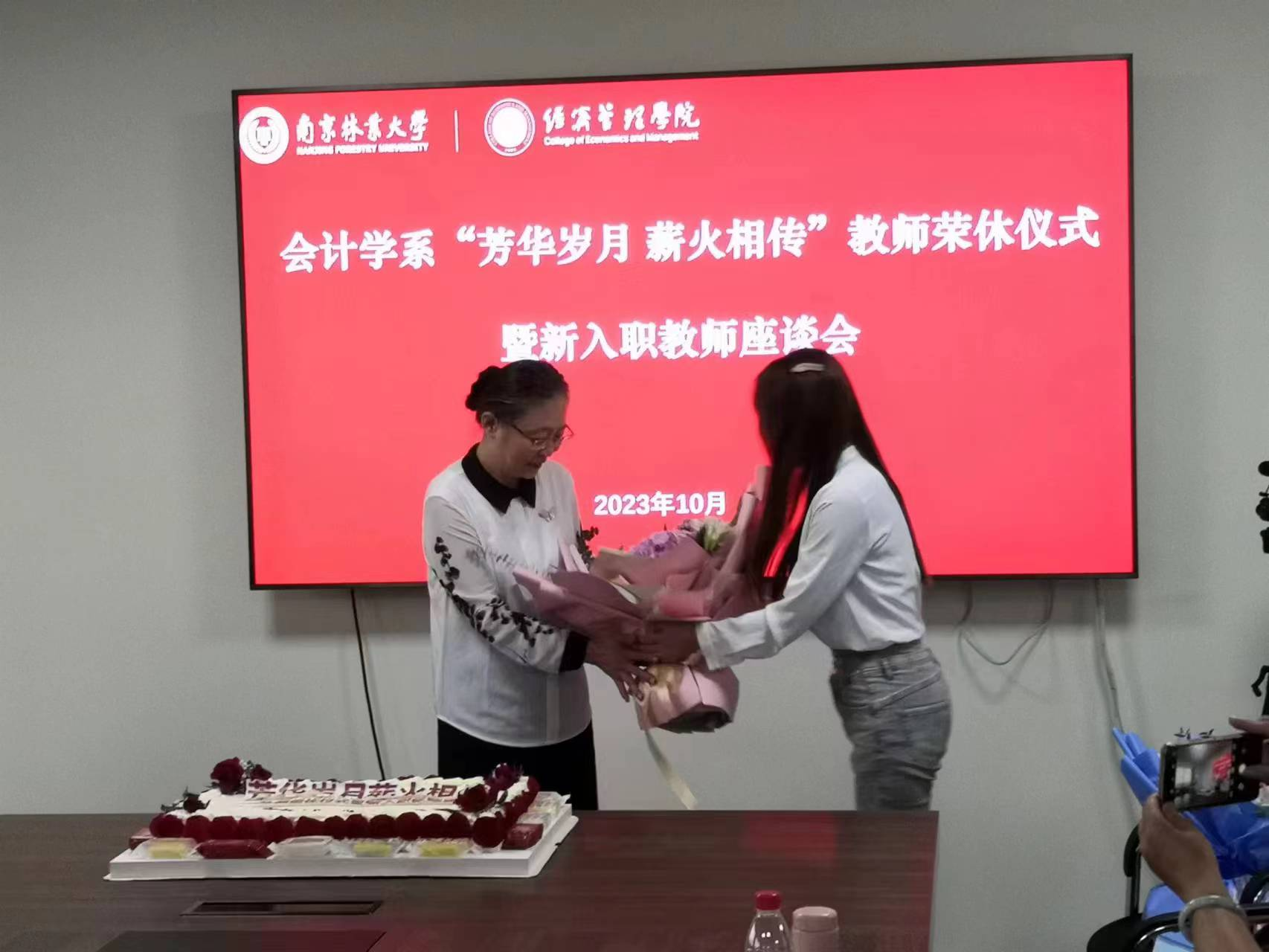 会计学系认真贯彻党的二十大精神,切实把党的关怀送到劳动群众心坎上,打造“芳华岁月薪火相传”的基层工作文化氛围。10月18日下午,会计学系全体教师在南林大厦502会议室举办一场即隆重又温馨的荣休暨新教师入职座谈会。全系教师对兢兢业业从事教学工作39年的陆萍教授表示感谢,并祝福陆萍教授即将开启的新生活。会议由支部书记邱强主持,经济管理学院副院长邓德强、王妹教授、曾华锋教授等会计学系全体教师参加会议。