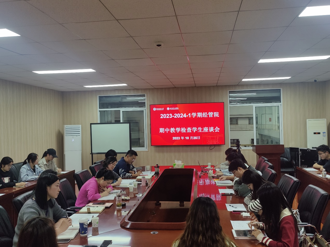 为了进一步加强对本科教育教学过程的动态管理和调控,提高教师教学能力和学生学习效果,完善健全教学管理制度, 10月25日下午,我院在教11号楼C208会议室召开2023-2024学年第一学期本科期中教学检查座谈会。我院副院长张玲、农林经济系主任宁卓、工商管理系主任王磊、管理科学与工程系主任李亚平、应用经济系主任王梅玲、会计系主任钟马、教学办公室高妍以及学院2021级各班学生代表等参加了会议。