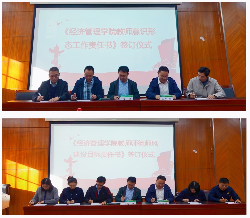 会议最后,高强和杨红强还与任课教师共同签订了《经济管理学院教师师德师风建设目标责任书》及《经济管理学院教师意识形态责任书》。