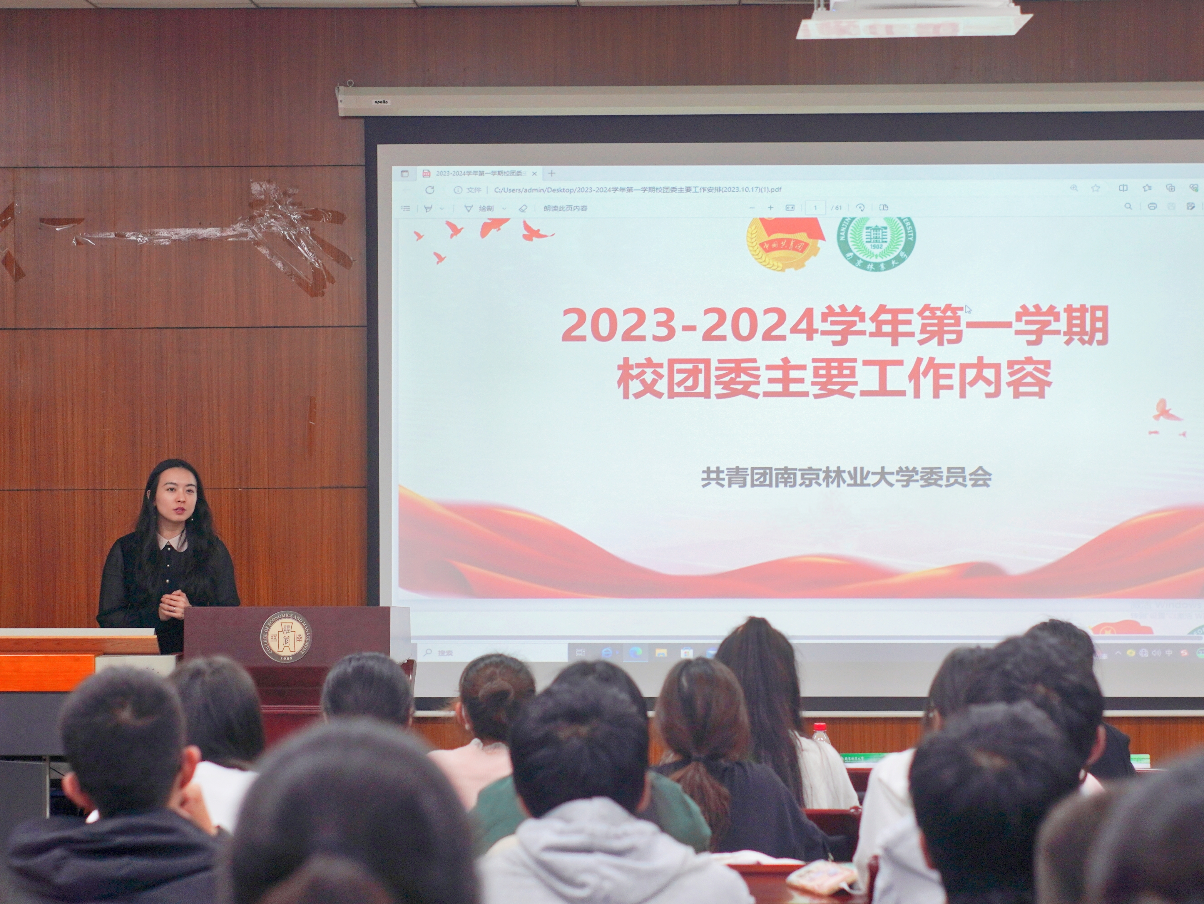 校团委宣传部部长申晶围绕“行知南林、创新南林、美育南林、实践南林、青春南林”五个模块,为同学们介绍了2023-2024学年第一学期校团委主要工作内容,并结合具体详实的数据展示了学校在各大赛事上取得的丰硕成果,鼓励经管学子积极参加各类活动,在实践锻炼中长才干、壮筋骨,续写学院发展新篇章。申老师勉励新一届学生干部在自己的岗位上发光发热,在水杉英才班挥洒青春汗水,让大学四年的生活更加充实、精彩。