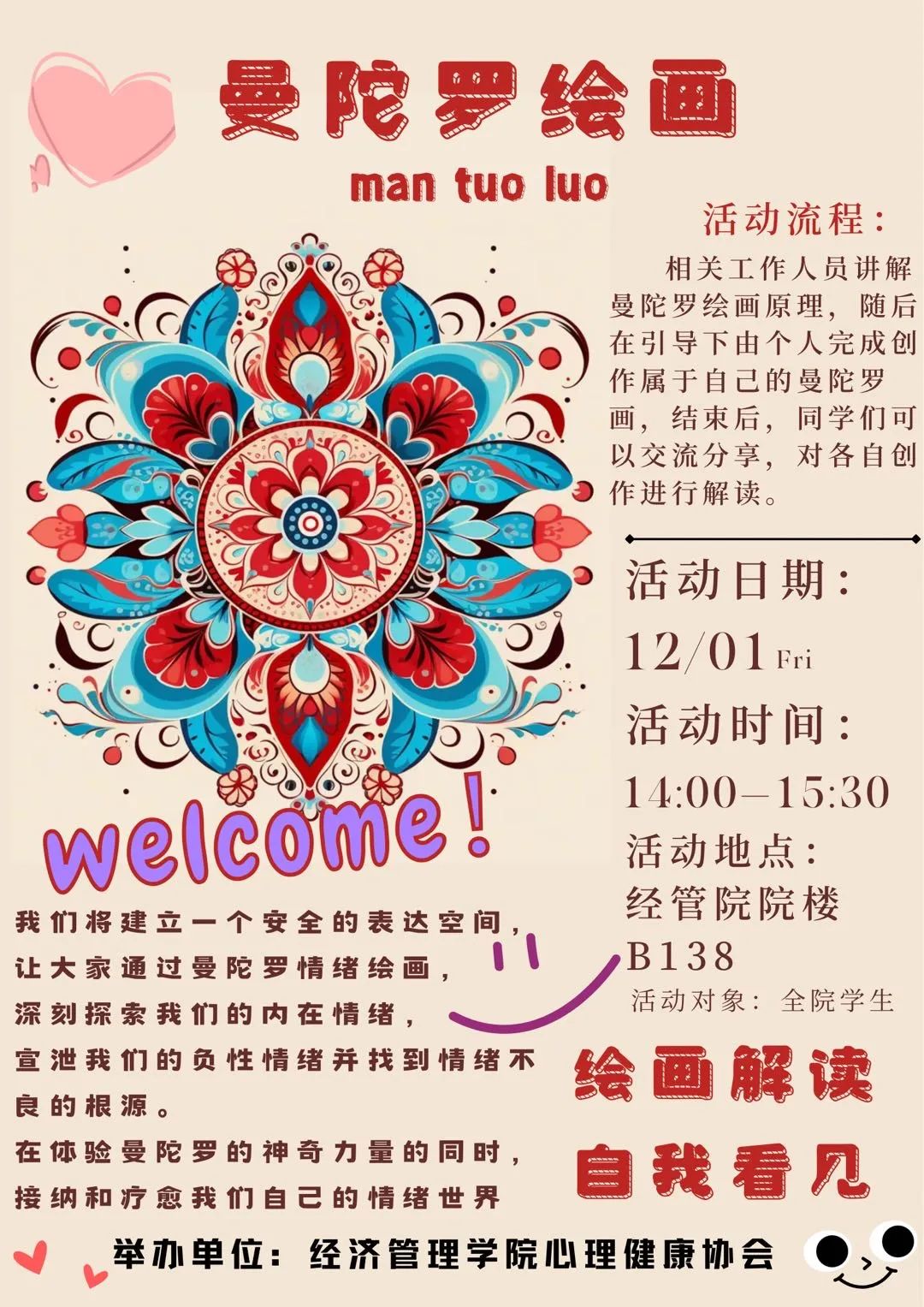 曼陀罗绘画是一种富有灵性和美感的艺术形式,可以帮助人们深入探索内心世界。通过曼陀罗绘画工作坊,我们希望引导经管院学生以创作的方式探索自己的内心世界以及强化表达能力。