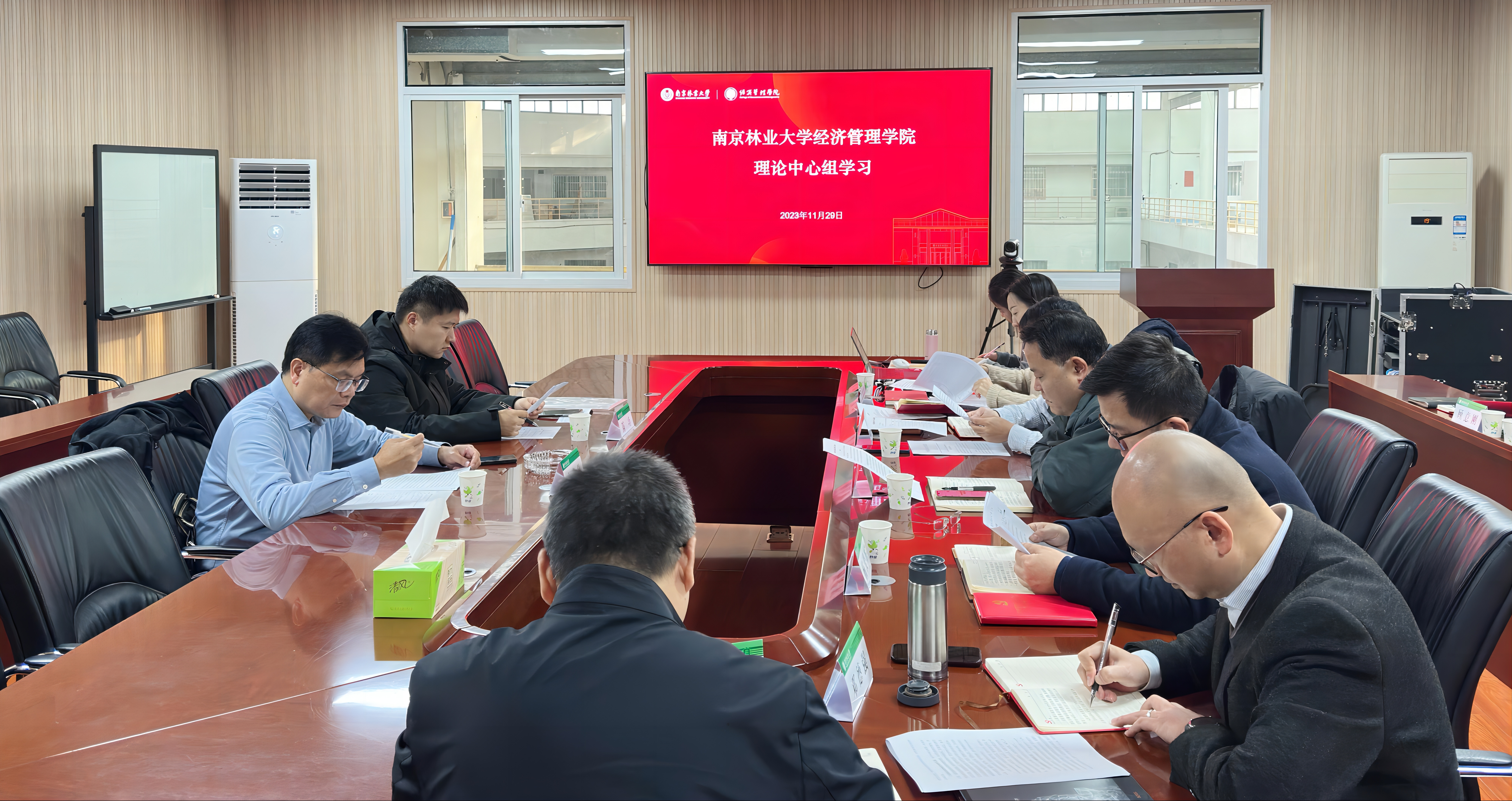 11月29日上午,院党委理论学习中心组在文科楼C208举行集体学习会,专题学习习近平总书记在全国生态环境保护大会上的重要会议精神。校党委常委、宣传部部长农春仕、党委宣传部正科级秘书陈功现场巡学旁听,经济管理学院理论学习中心组全体成员参加。院党委书记高强主持学习会。