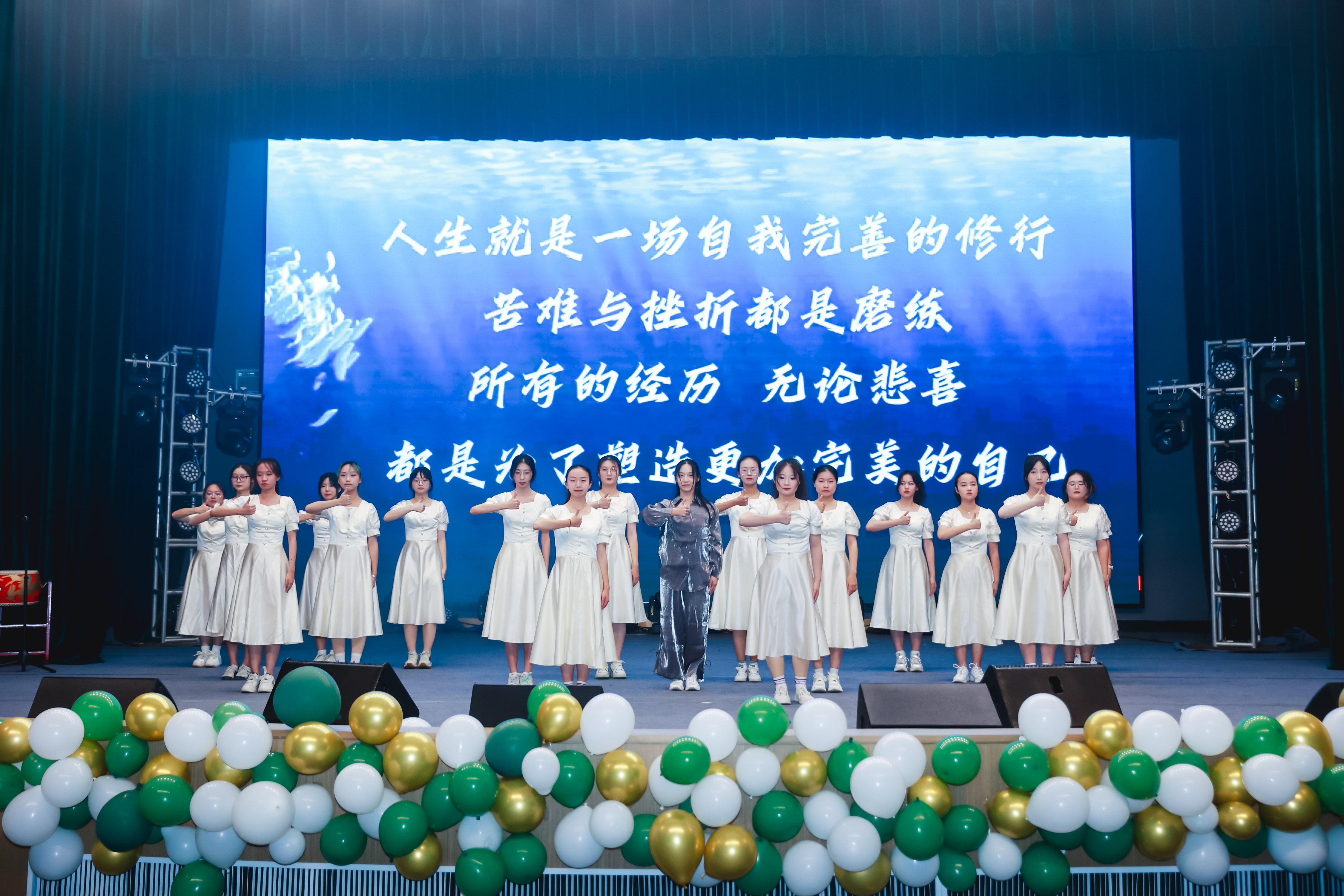 晚会走向尾声,辅导员老师们走上舞台。心中有梦,相信彩虹,尽管前路漫长,但他们已做好准备,与你一同前往。
