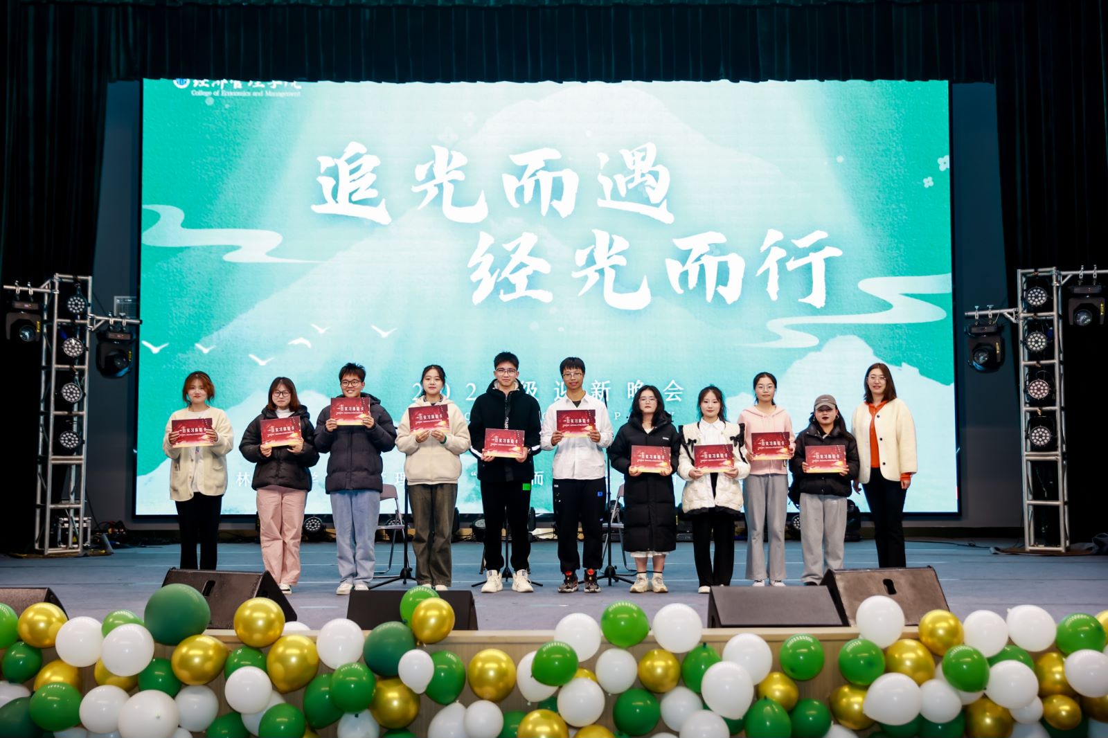 此次经济管理学院迎新晚会,呈现出了一场青春的盛宴。今夜的美好回忆将成为我们未来学习和生活的不竭动力,愿全体经管学子追逐光,靠近光,成为光,散发光,将个人理想融入时代浪潮,贡献南林青年的智慧与力量。