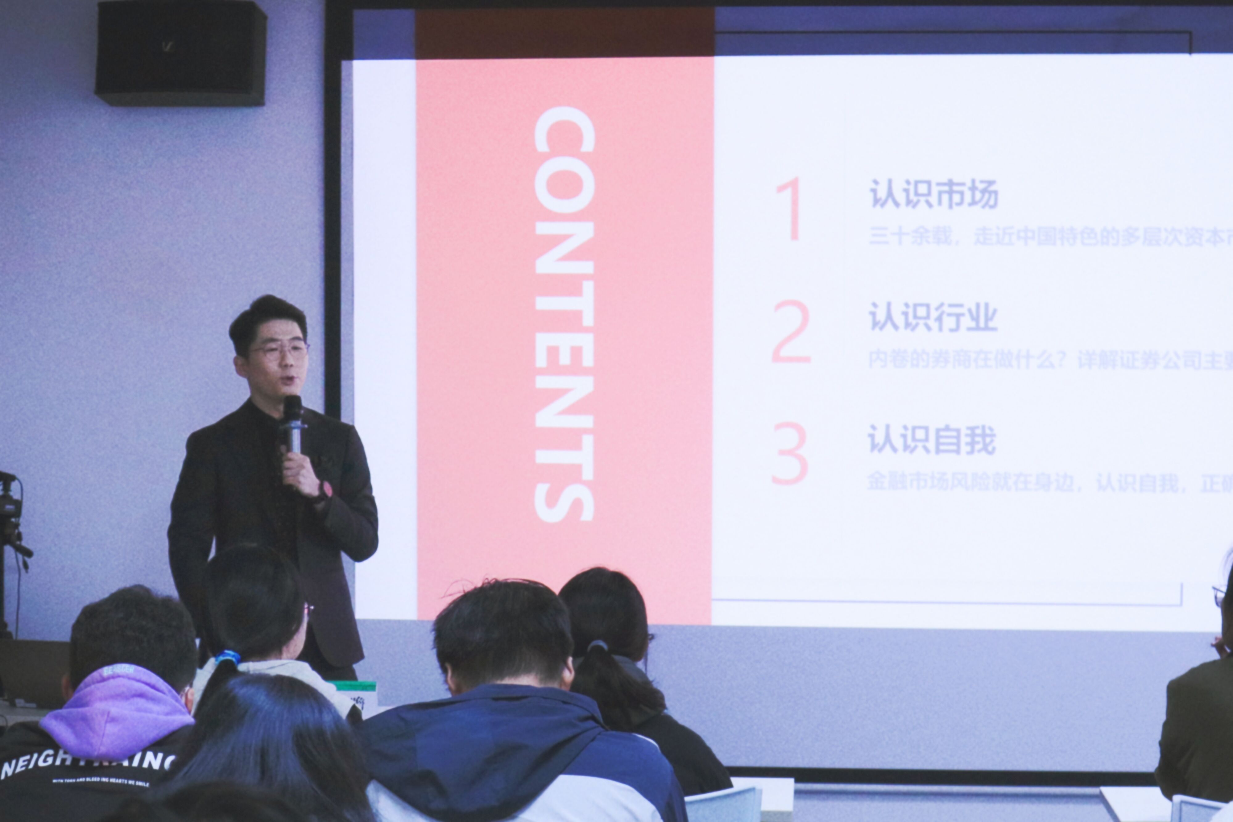 纪子瞻老师从认识市场、认识行业、认识自我三方面进行讲解。他表示要通过多层次、宽领域、全方位地介绍中国资本市场,勾勒出当前市场形态。讲座中,纪老师详细介绍了证券公司的主要业务,并以个人经验为例,给予同学们就业指导和建议。最后,通过介绍三种大学生常见的金融骗局:校园贷、非法集资、杀猪盘,告诫同学们一定要谨防金融诈骗,明白自身使命,明辨是非,做新时代大学生。