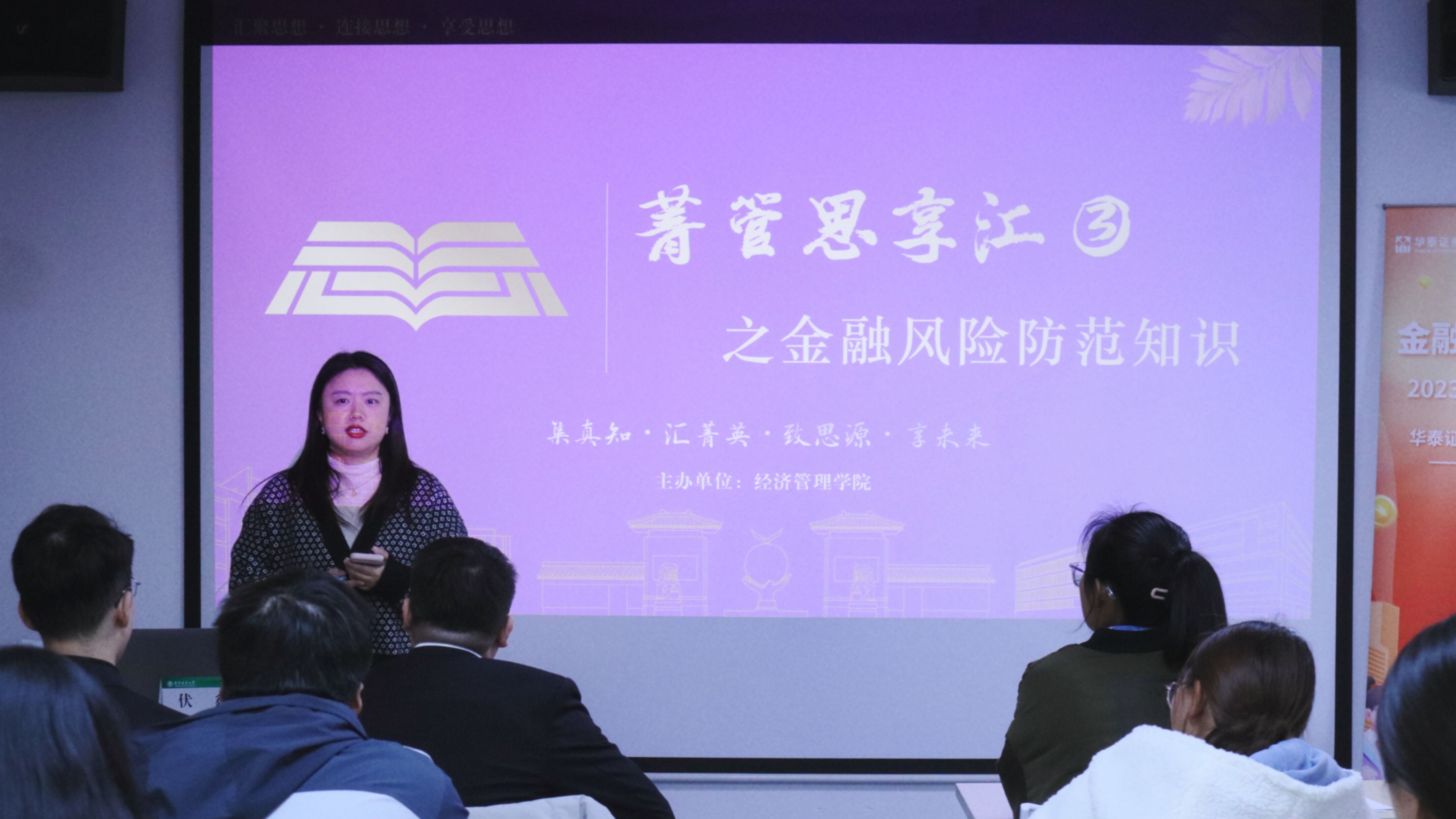 汇聚思想菁华,学习相关知识,汲取前进力量。12月6日下午,为增进学生对金融行业的了解,防范金融风险,预防金融诈骗,经济管理学院第三期“菁管思享汇”学生思想政治教育品牌活动在南林大厦610教室举办。本次活动邀请东吴证券投资者教育基地讲师伏鑫、华泰证券投资者教育基地讲师纪子瞻进行讲解,学院团委书记、学工办主任赵淑颖老师主持。