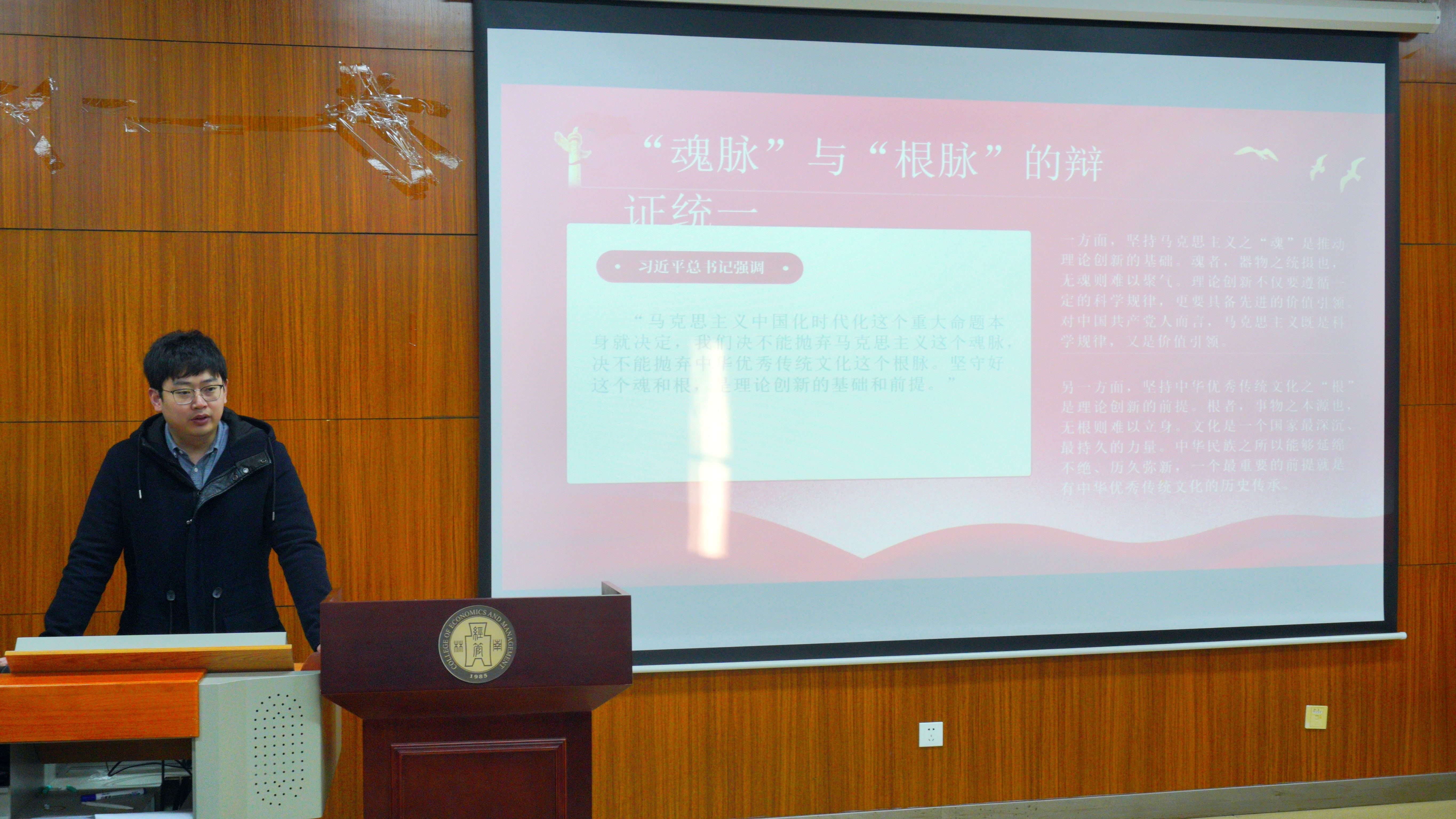 为深入学习贯彻习近平新时代中国特色社会主义思想主题教育,培养广大青年的历史责任感和时代使命感,12月25日,经济管理学院在文科楼C103开展了题为“习近平文化思想的哲学意蕴”的主题教育活动。本次讲座特别邀请了2020级淮安校区本科生辅导员陈鸣晖老师作为主讲嘉宾,水杉英才初级班学员积极参与,活动由洪钰璇同学主持。