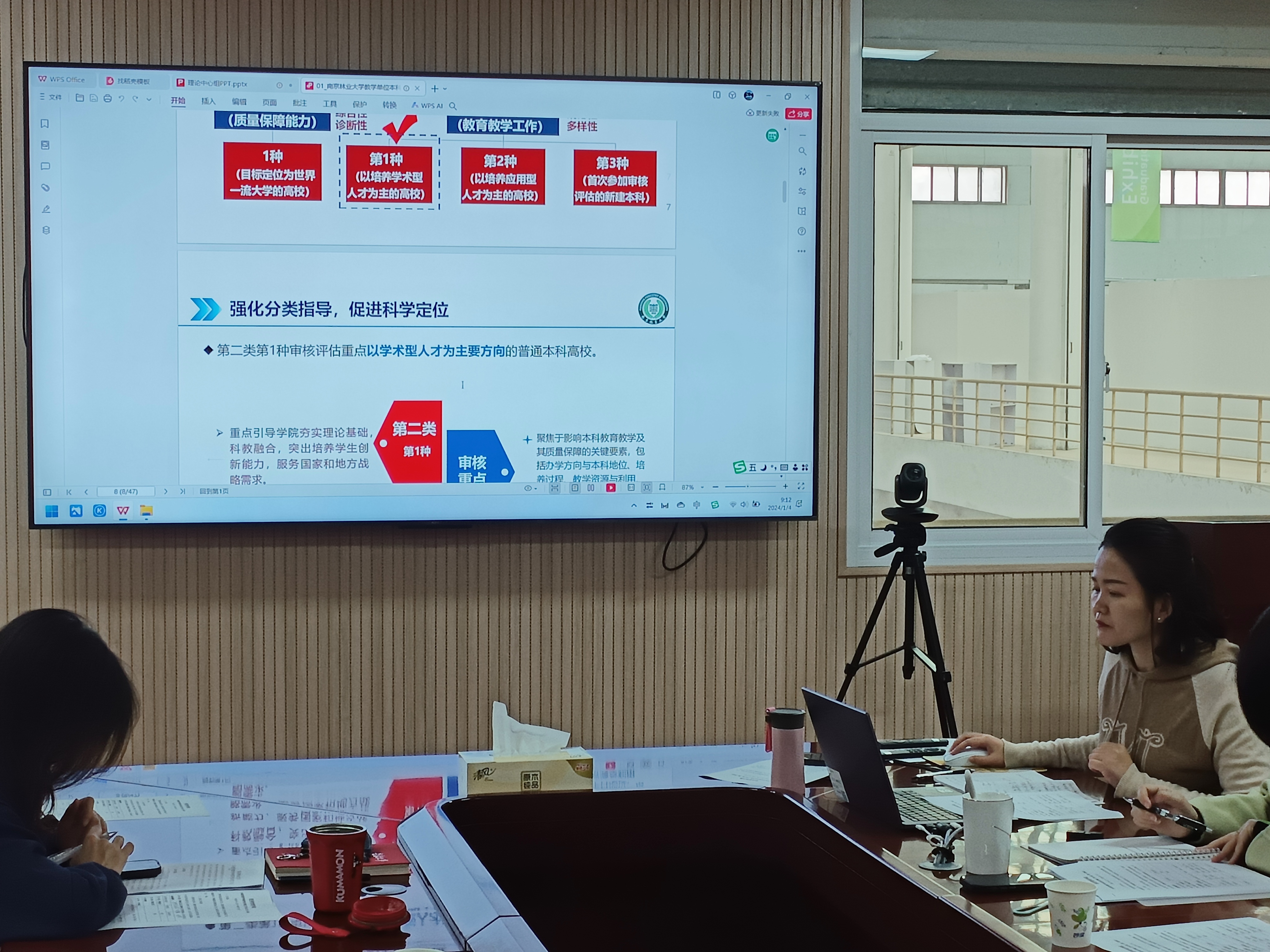 首先,张玲副院长对学院本科教育教学自评工作要点进行了介绍,解读了学院自评报告的指标内涵和相关要求,并据此制定了自评报告撰写的分工计划,梳理了各分工负责人需要提交的材料,明确了工作推进中几个重要的时间节点。与会人员认真学习,深入探讨和交流了存在的困难和问题。