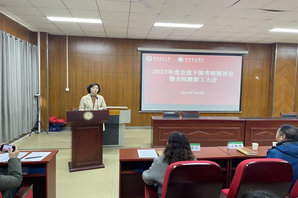 2023年3月6日下午,2023年度处级干部考核测评会暨全院教职工大会在经管院C105报告厅召开。校党委常委、副校长缪子梅出席并主持考核工作会议,纪委副书记吴胜利、组织部副部长何星、党委办公室正科级秘书唐荣宁,以及经济管理学院全体教师参加会议并听取了学院领导班子成员2023年度就分管工作进行的述职汇报。