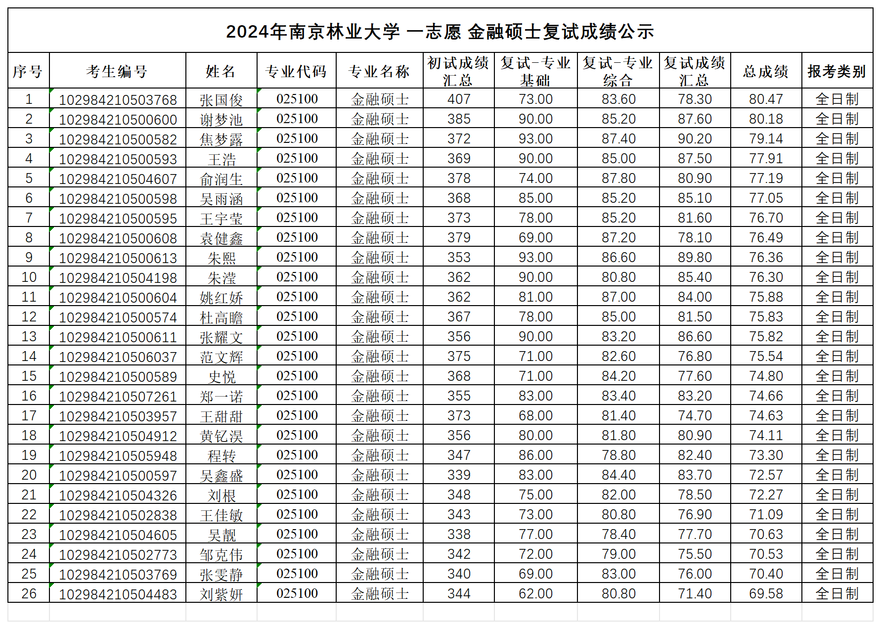2024年南京林业大学 一志愿 金融硕士复试成绩公示