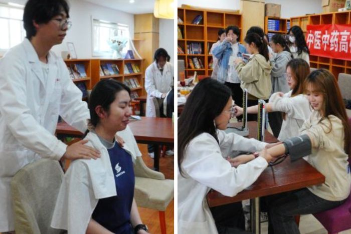 此次体验活动包括古法推拿、血压测量和经方药茶品尝三个环节,在提供健康服务的同时也向同学们科普了医学知识,弘扬了中医药文化。