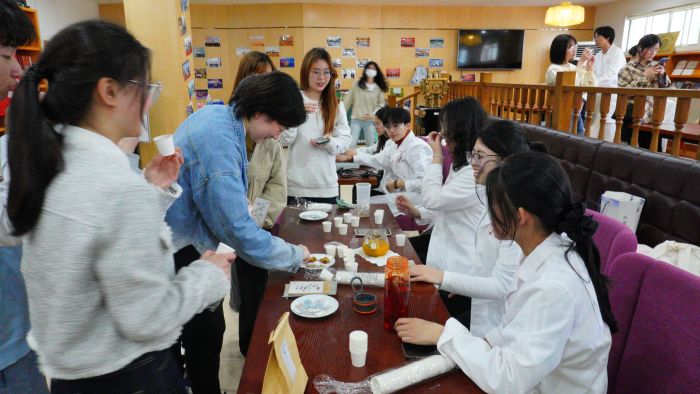 经方研究分会将常见经方做成代茶饮供大家品尝,如三黄汤、酸梅汤、甘麦大枣汤等,强调药食同源的同时,针对不同同学的体质状态提供一些安全可行的经方代茶饮以供参考,为同学们科普经方知识,提供养生指南。在品尝过程中,有的同学觉得入口苦涩,也有同学感慨原来中药也会有甜味,经方研究分会同学提示说不同体质的同学对于经方的口感反馈也会存在不同。