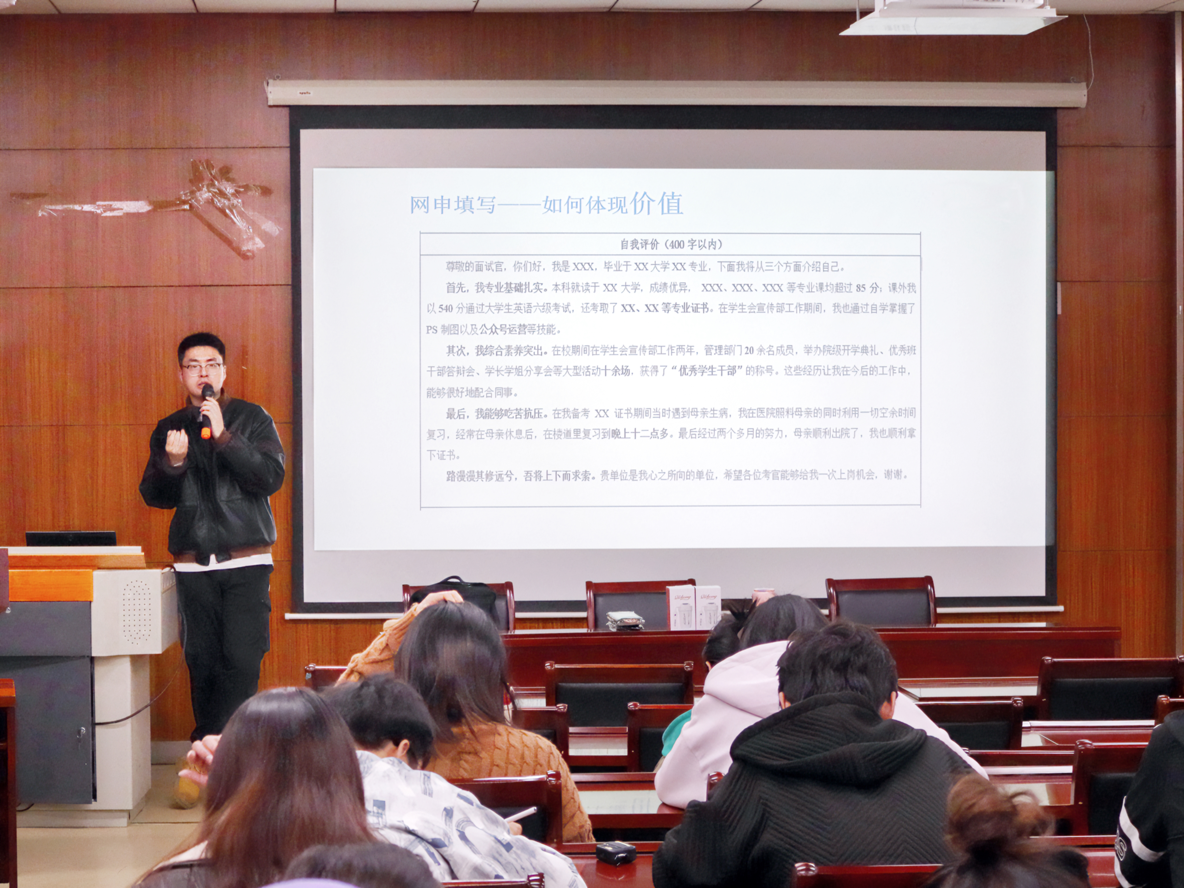 讲解过程中,张思维老师首先通过一系列互动提问,以轻松幽默的方式让同学们对银行从业的优劣势有了直观的了解。接着,张思维老师详细讲解了网申所包括的六个部分:基本信息、教育背景、能力水平、实践经历、家庭背景和开放性问题。他特别强调了实践经历撰写需要充分利用好“STAR”(Situation、Task、Action、Result)法则,通过具体的、数字化的描述支撑实习经历带来的收获,给简历提升含金量。此外,张老师还就如何自我介绍、自我评价给出了宝贵的建议,并展示了几个优秀范例,让大家更加深刻把握撰写简历的核心要点。为了让同学们更加清晰地了解银行网申步骤,张思维老师还通过播放视频讲解和现场实际操作的方式,详细展示在网申中的注意事项。他建议同学们使用关键词来分条举例,这既有利于提高机器筛选的准确性,也能在短时间内给HR留下深刻印象,通过展示运用关键词前后的效果对比,让同学们深刻体会到了技巧填写的重要性。