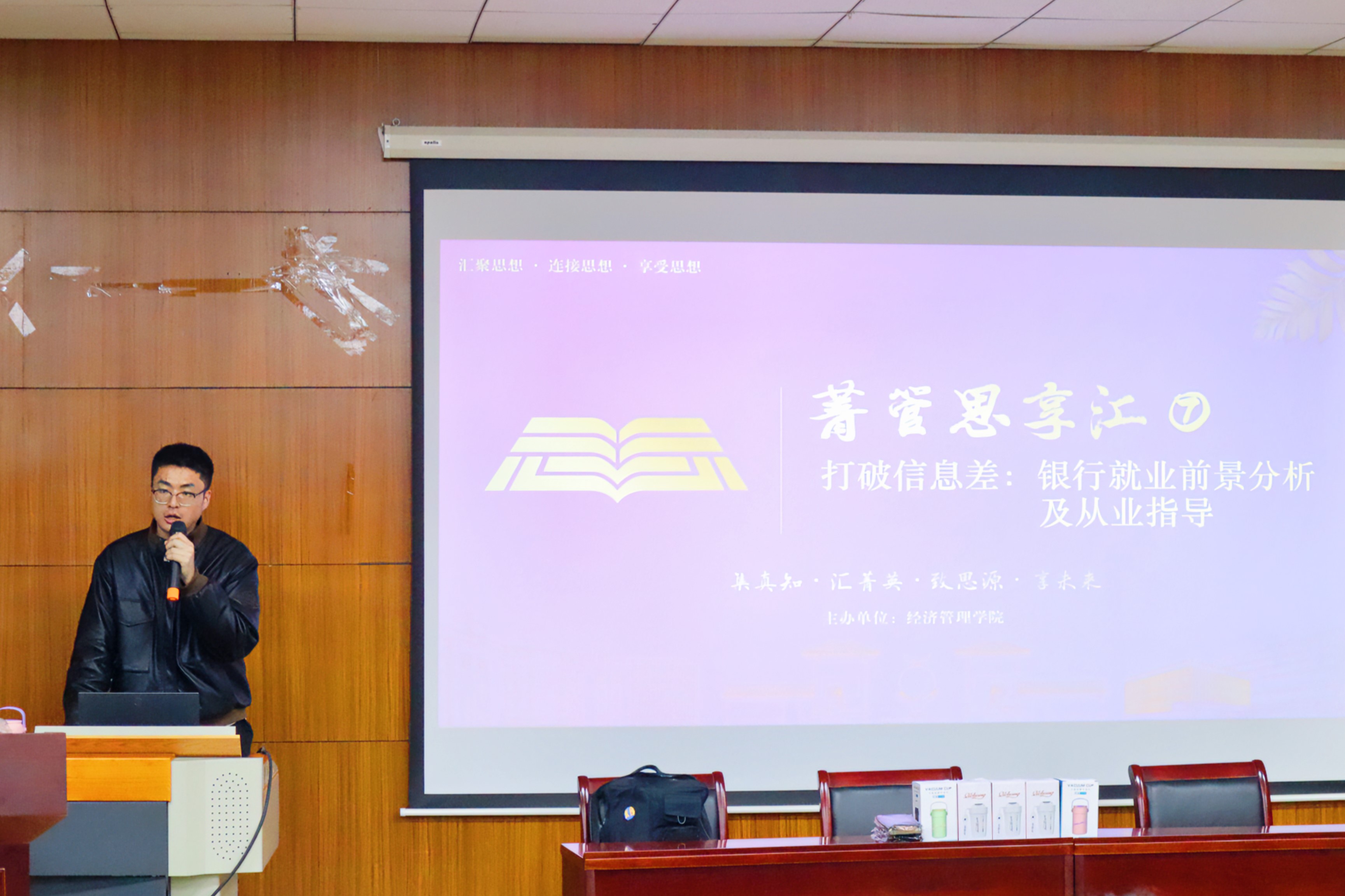 为了增强学生的职业意识,了解银行业就业形势,明晰自身求职就业方向,提高核心就业竞争力,增加面试录取机会。4月3日下午,经济管理学院第七期“菁管思享汇”活动在C103举办。本次活动由资深银行从业者、面试培训讲师张思维老师讲解,学院辅导员陈鸣晖老师主持。
