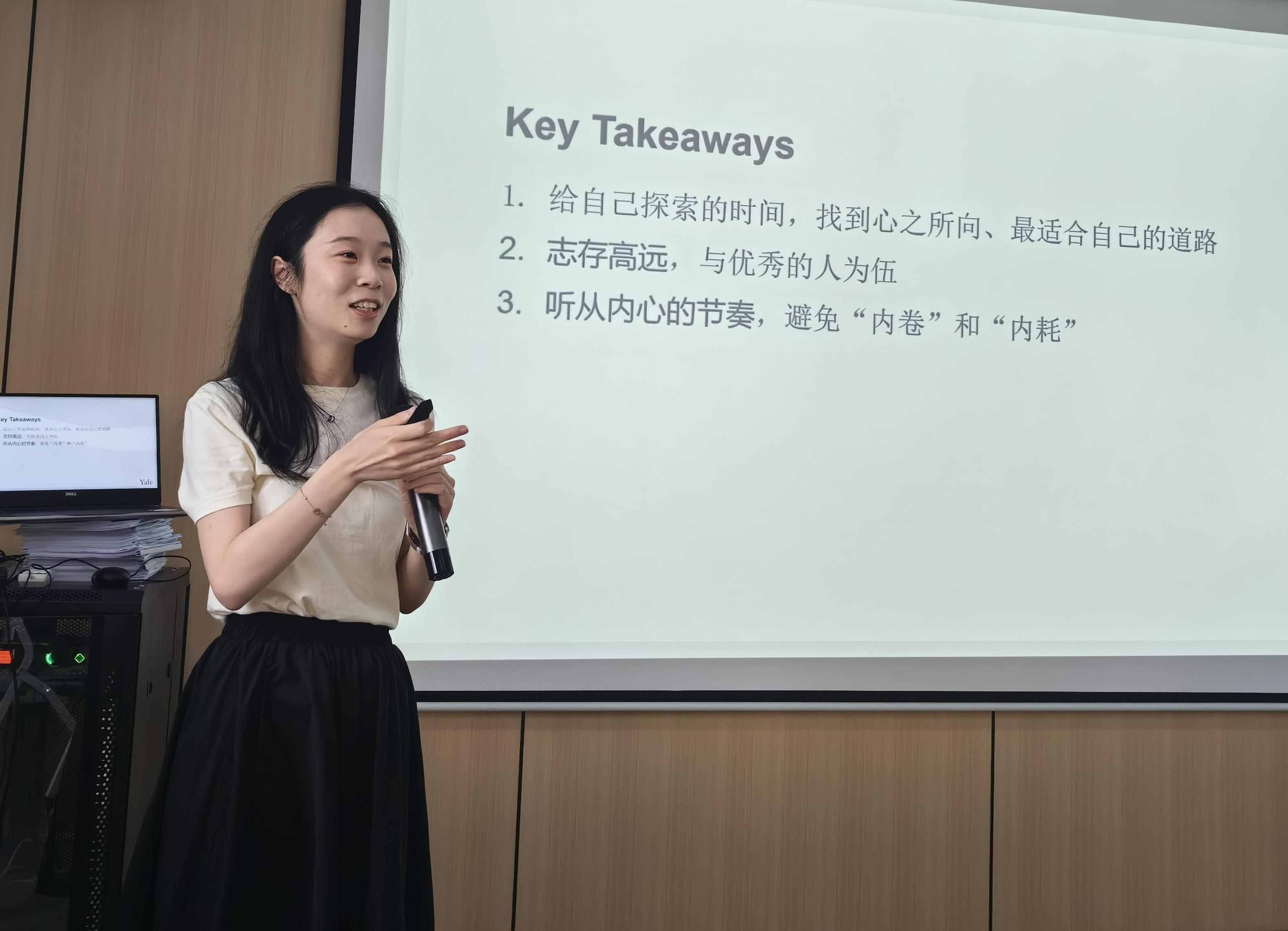 分享环节中,杨以宁首先介绍了自己目前的研究领域和研究成果。其次,她向同学们讲述了在留学过程中的氛围环境、团队、社会文化以及相关趣事,让同学们对国内外高校教与学的差异有了更加直观的认识。最后杨以宁给了同学们三点建议:一是要积极尝试和探索,找到心之所向且适合自己的道路;二是要志存高远,一直与优秀的人同行,自己也会变得更优秀;三是要坚定内心方向,找准自己的前进节奏。