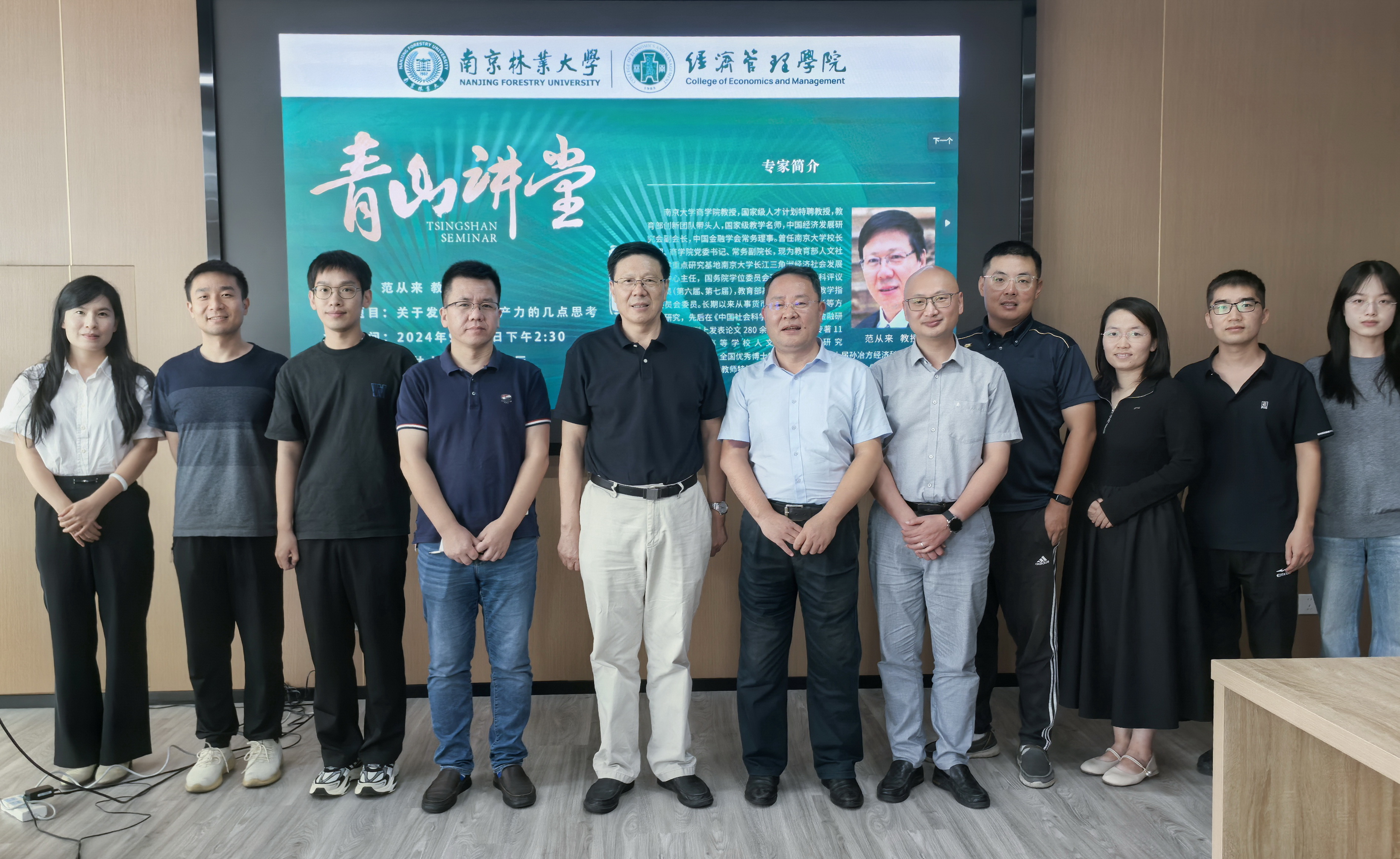 最后,杨红强院长对范从来教授的精彩报告作了小结点评,认为本次报告主题鲜明、内涵丰富,具有重要学术性和指导性,并建议中青年教师结合实际重视和加强关于新质生产力等问题的科学研究和实践应用。会后,范从来教授与学院青年教师合影留念。