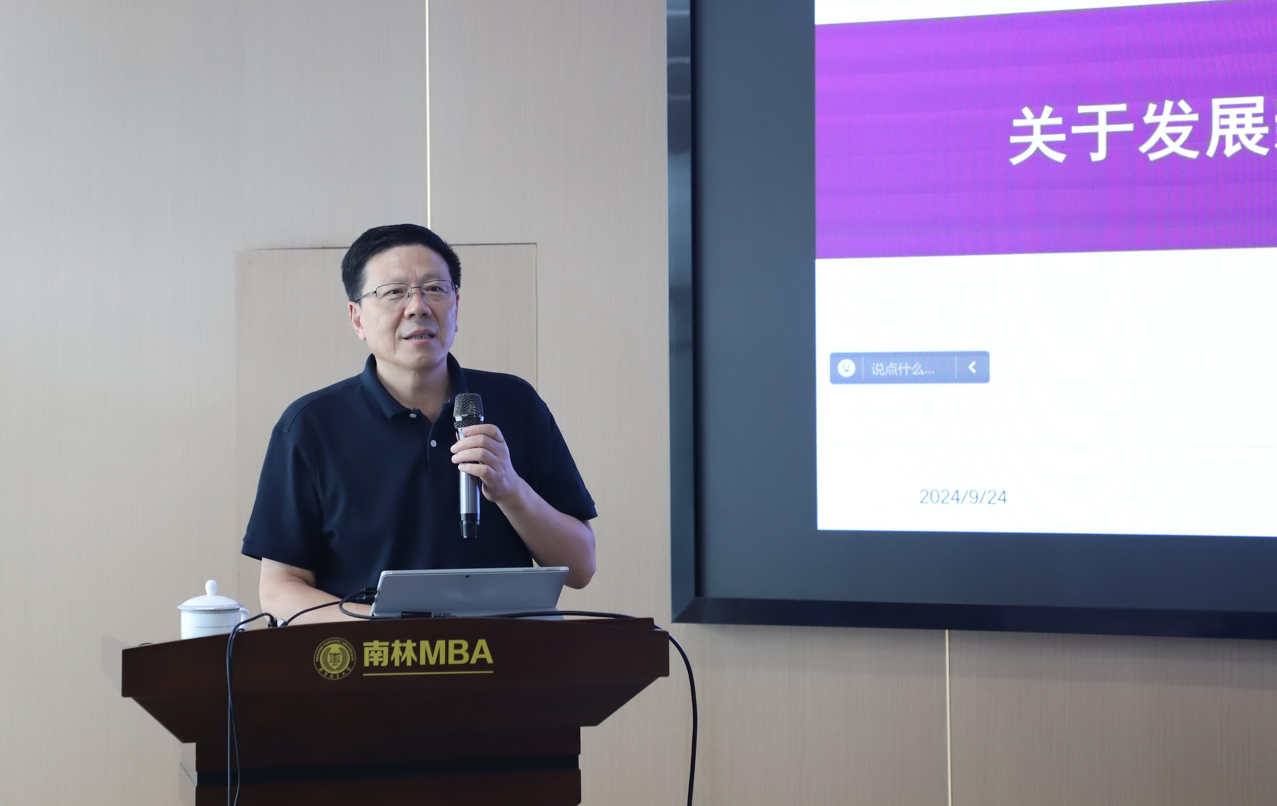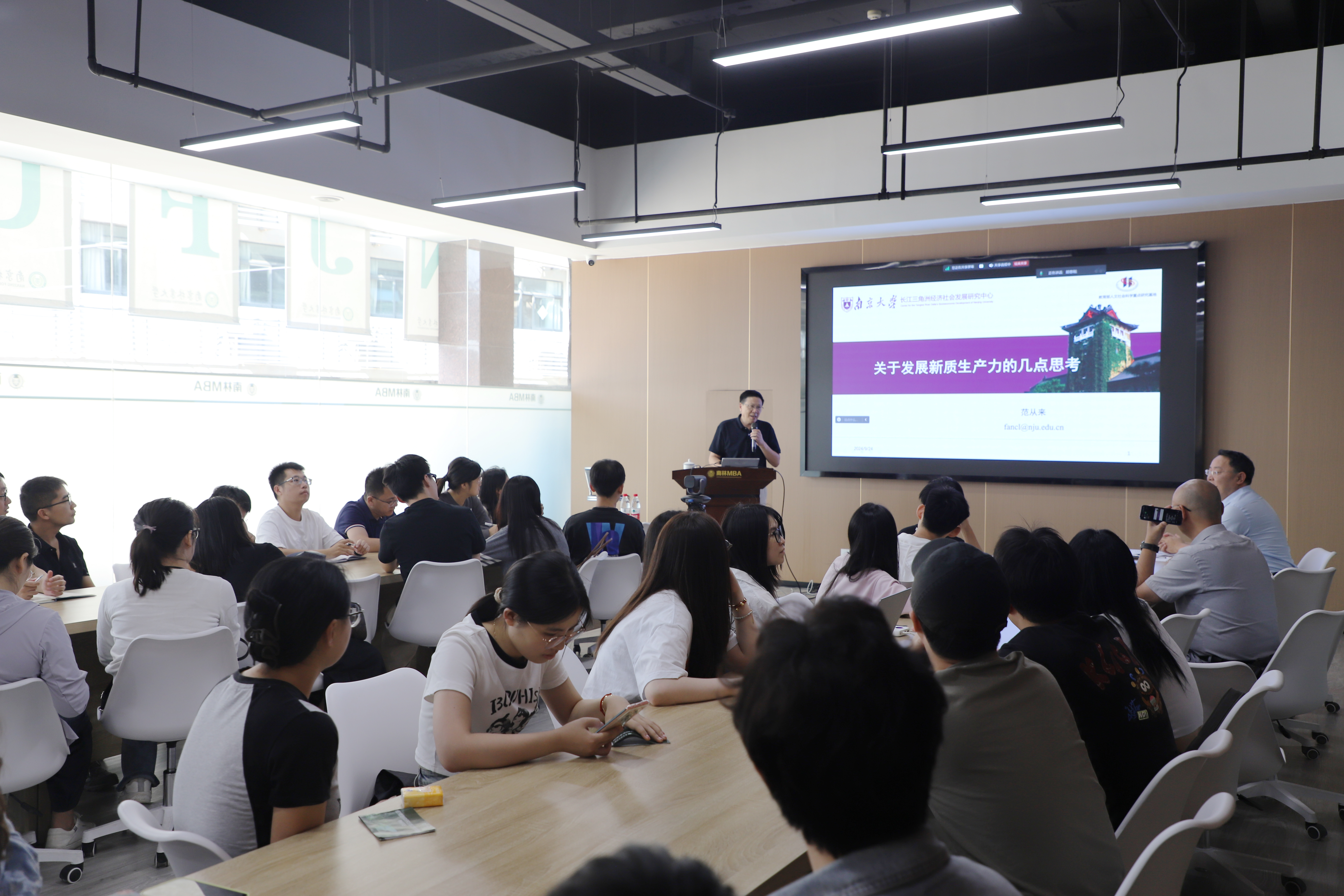 9月24日下午,我院“青山讲堂”第三十五期学术报告在南林大厦一楼MBA学术报告厅举行,报告邀请著名经济学家、南京大学范从来教授主讲,本次报告为“学习贯彻党的二十届三中全会精神”专题学术报告,报告题目为《关于发展新质生产力的几点思考》。学院各学科中青年教师以及博硕士研究生共50多人参加线下讲座,报告同时在“三农学术”在线直播,线上参加报告的国内专家学者和研究生达1400余人。本次“青山讲堂”讲座由学院院长杨红强主持。