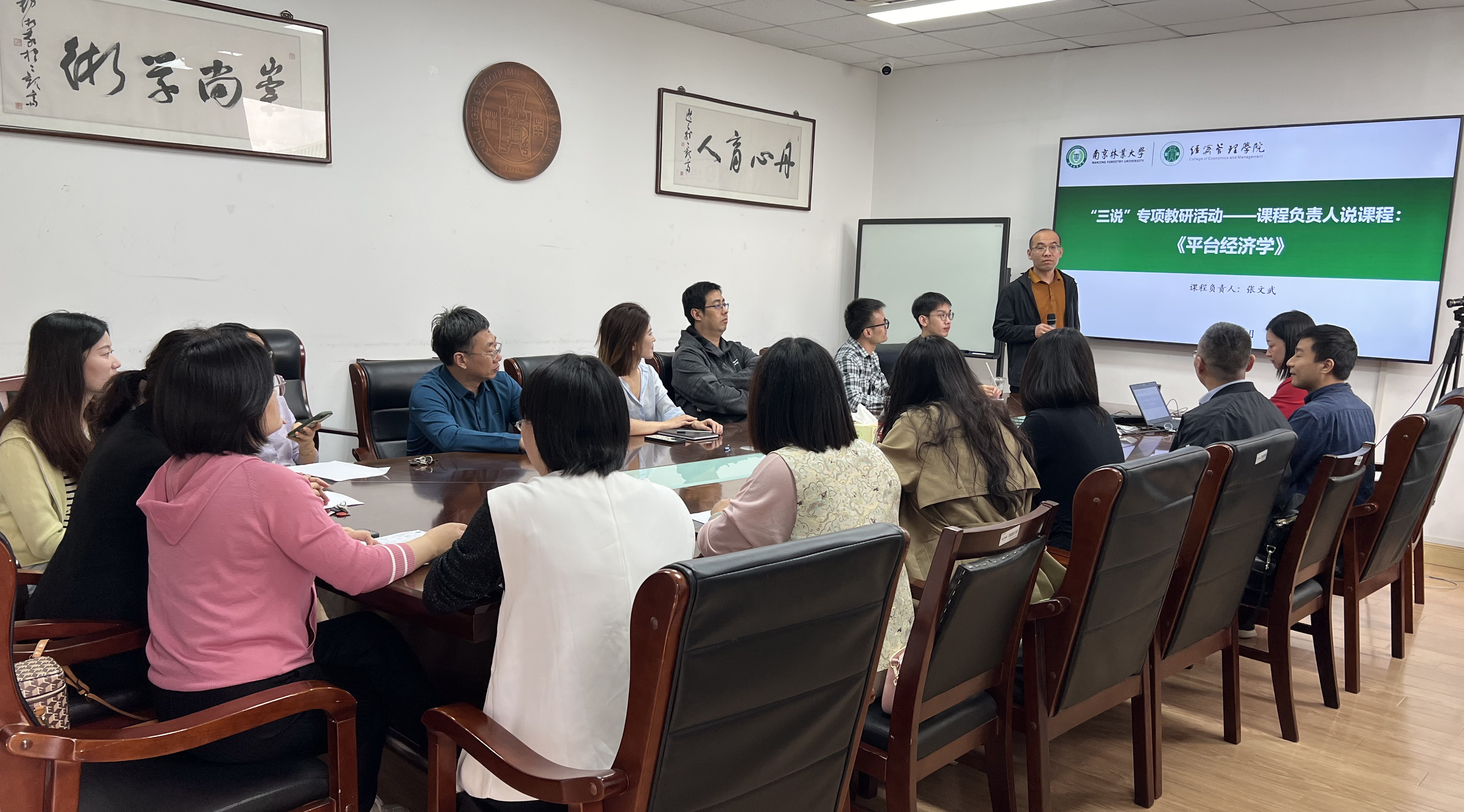 首届全国高校黄大年式教师团队核心成员,江苏333高层次人才工程中青年学术带头人——数字经济专业教师张文武教授以《平台经济学》这门课程为对象,向系里教师介绍了该课程改革思路与发展路径,并在课程目标、课程思政、教学内容、教学设计、考核方式等方面分享创新性实践经验。张教授以深厚的学术背景、丰富的教学经验以及详实的课程案例资料,展示了精品课建设的全过程,并提出精品课程建设的导向重在促进教学观念的转变,体现教学理念的变化,建议对学生学习过程进行持续评估,采用多元化评价标准,全面、多角度地反映学生学习成果,包括知识、技能、素养等方面成果。