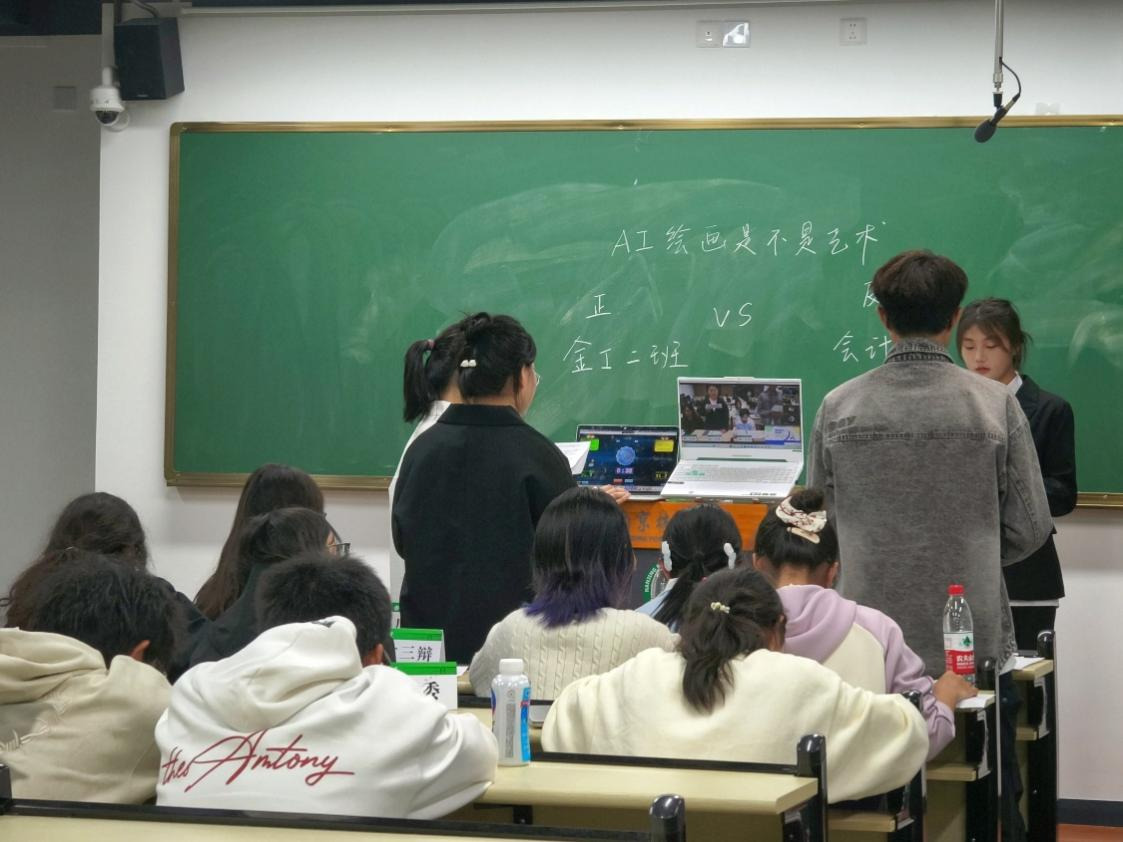 在金工二班和会计班对于“AI绘画是不是艺术”的辩题中,正方一辩从艺术的本质谈起,强调人类的主体意识对于某一客体艺术身份认定的重要性,坚定认为AI作画应该被认为是艺术。反方一辩开宗明义,提出AI的创作是基于大量的数据分析和模拟,缺乏艺术所必须的创造性,没有真正的情感和思想,这种技术产物不是真正的艺术。