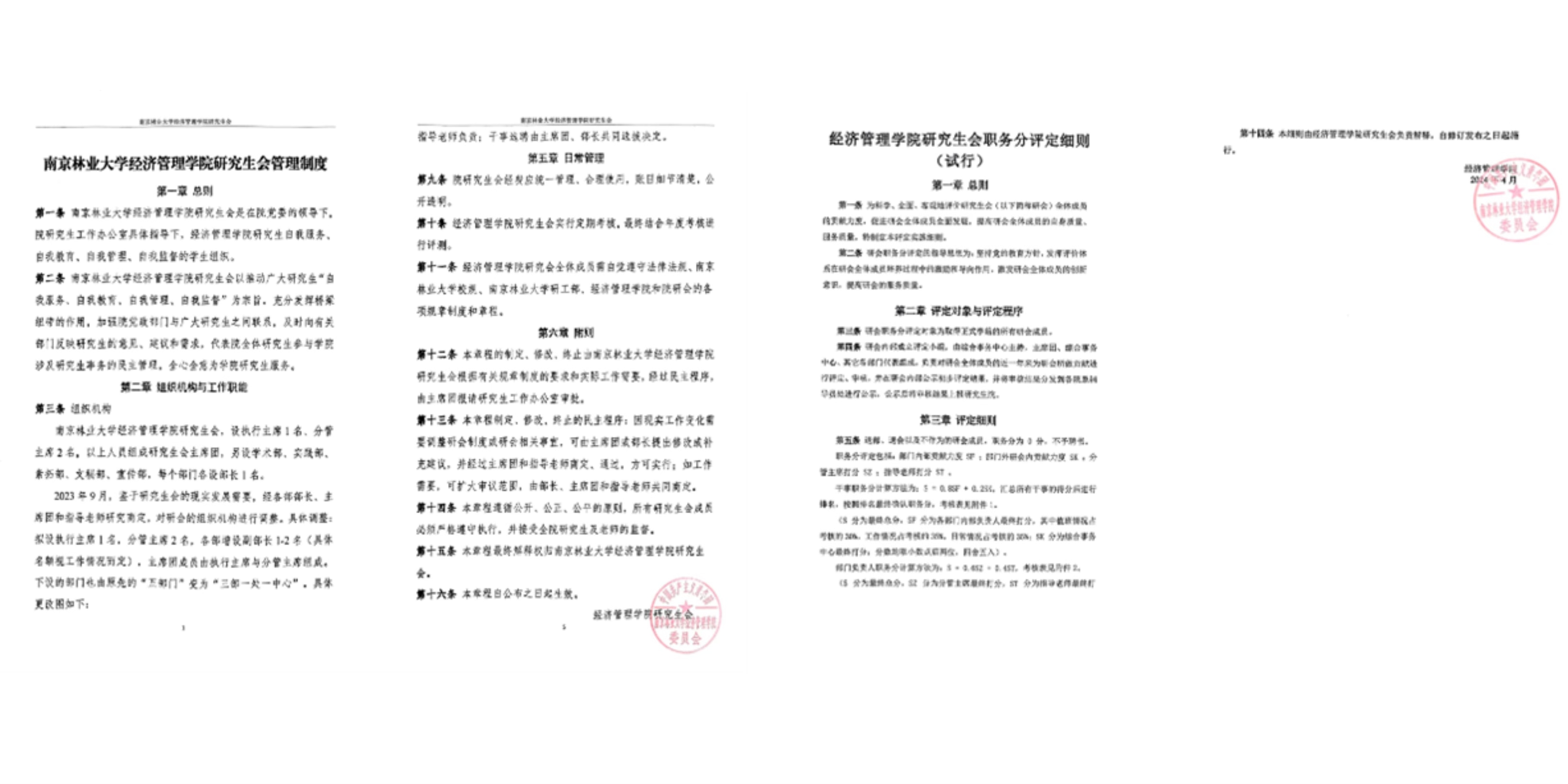 在管理体系方面,学院研究生会根据学校相关要求扎实开展各项工作,按照“规范化、透明化、公正化”原则,修订完善《南京林业大学经济管理学院研究生会管理制度》(2024版),进一步明确各部门的职责分工,召开工作例会15次,按时举行学院级研代会和换届选举工作,确保各项工作规范、有序开展。同时,为建立合理、科学、高效的考核激励机制,学院研究生会修订《经济管理学院研究生会职务分评定细则》(2024版),对研究生会学生干部的工作表现进行过程性评估,促进研究生会全体成员全面发展。