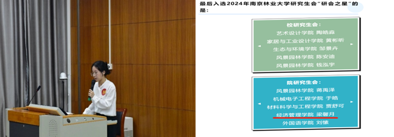 (图为2024年南京林业大学研究生会“研会之星”评比活动现场及评比结果)