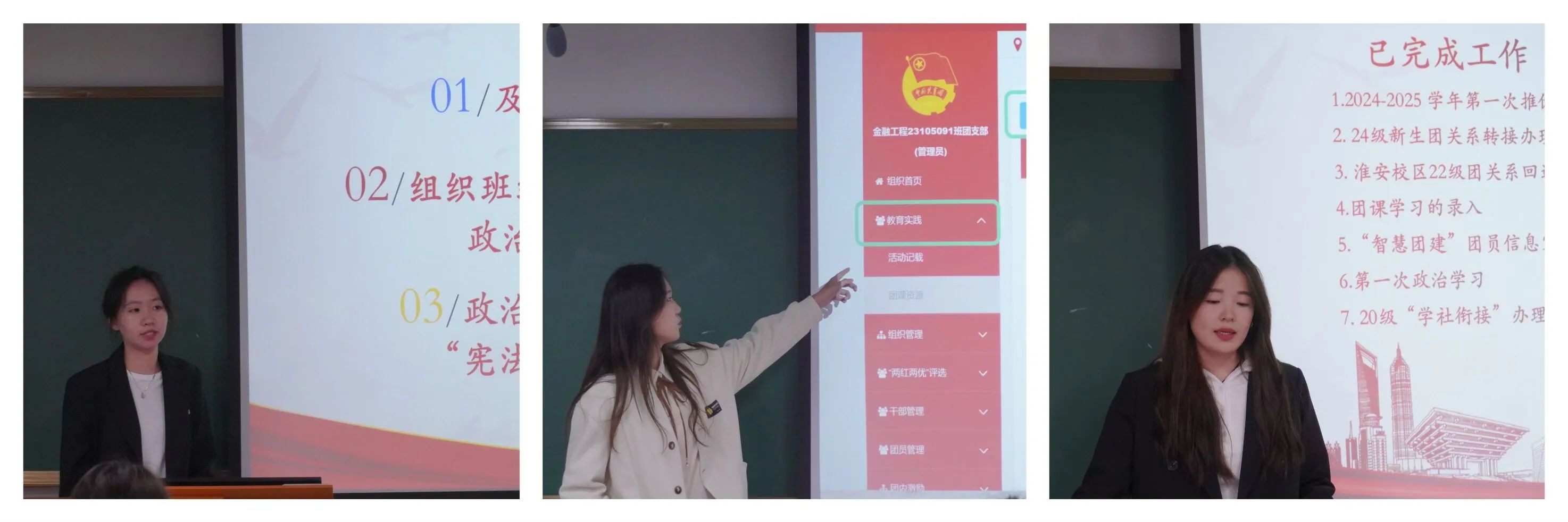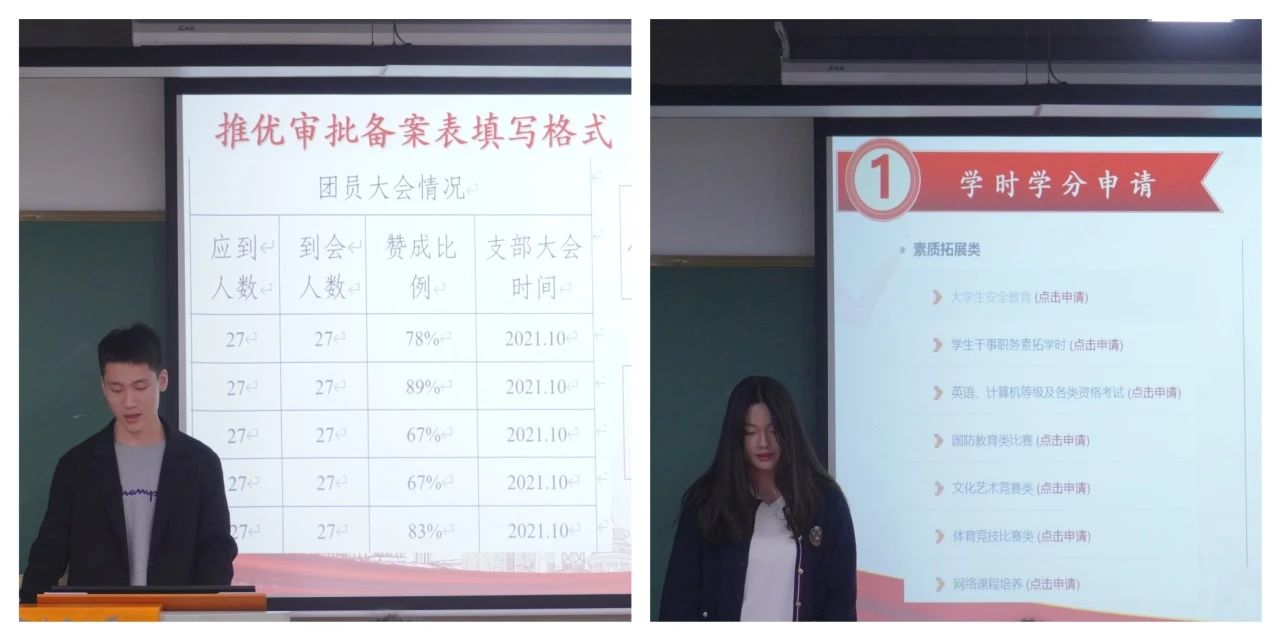 学生会组织部部长祝澜芳介绍了政治学习相关工作,希望团支书以团支部为载体组织全班同学认真完成政治学习,督促同学完成PU形势与政策课学时认定。组织部副部长高二燕介绍了本学期组织部已经开展的相关工作和即将要开展的工作,希望团支书作为团组织和个人之间沟通的桥梁,要做好上传下达工作。组织部副部长高歌介绍了智慧团建操作方法,包括教育实践专题录入、团组织关系转接审批、生成重置密码验证码等,她建议团支书尽快熟悉并规范使用智慧团建系统。组织部副部长艾健雄详细介绍《经济管理学院推优工作条例》,对推优入党的流程、被推荐人需符合的要求、表格的规范填写及注意事项等进行详细的解读。学习实践部副部长王誉洁主要介绍了PU口袋校园学时学分的申请流程、日常活动学时的获取、寒暑假社会实践材料的上报要求以及学生学时学分的合格标准等。