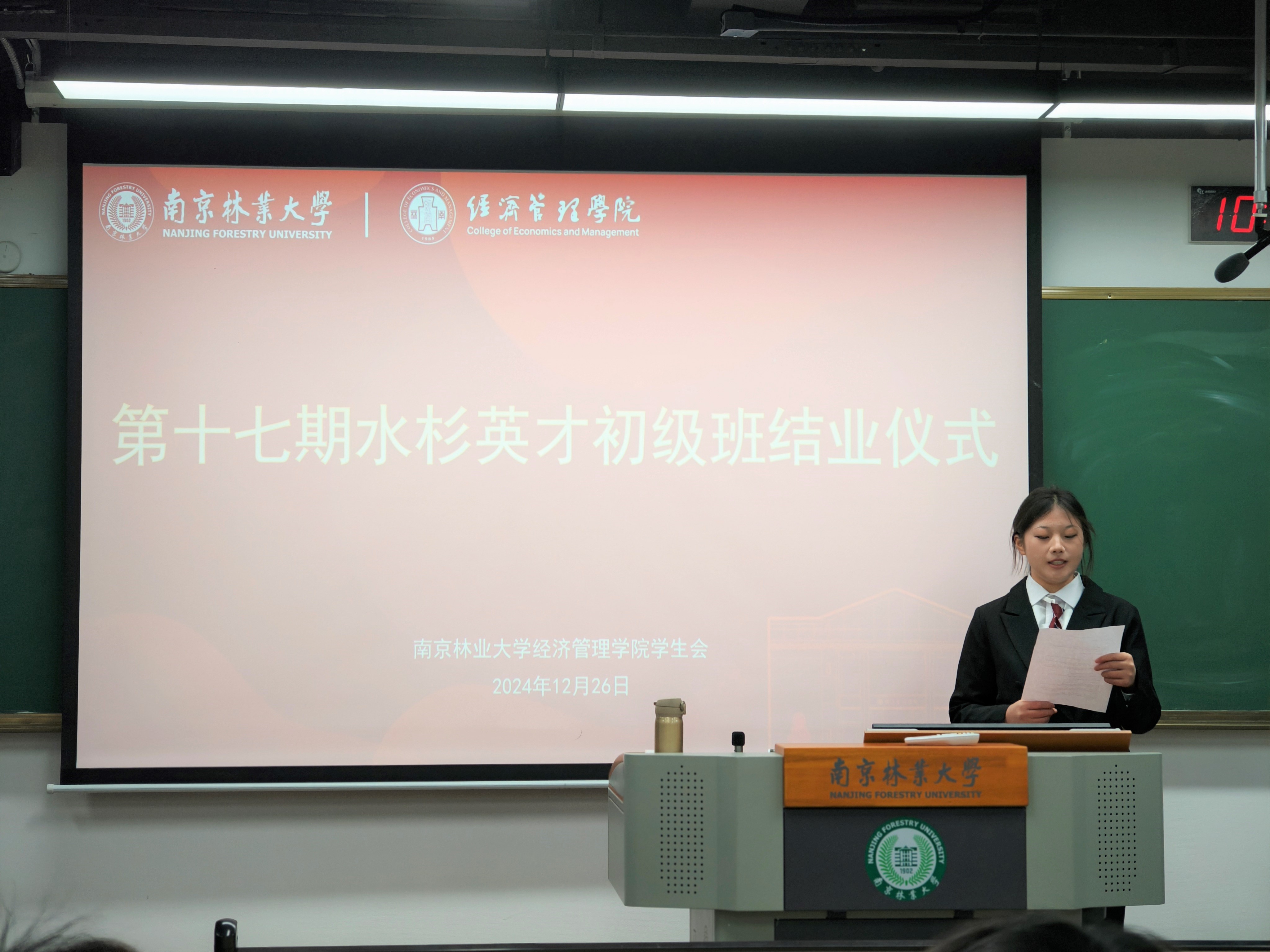 12月27日上午,经济管理学院第十七期水杉英才初级班结业仪式在白马校区三号楼3310教室举办。24级辅导员陈鸣晖老师参加此次活动,活动由学生会学习实践部王天云主持。