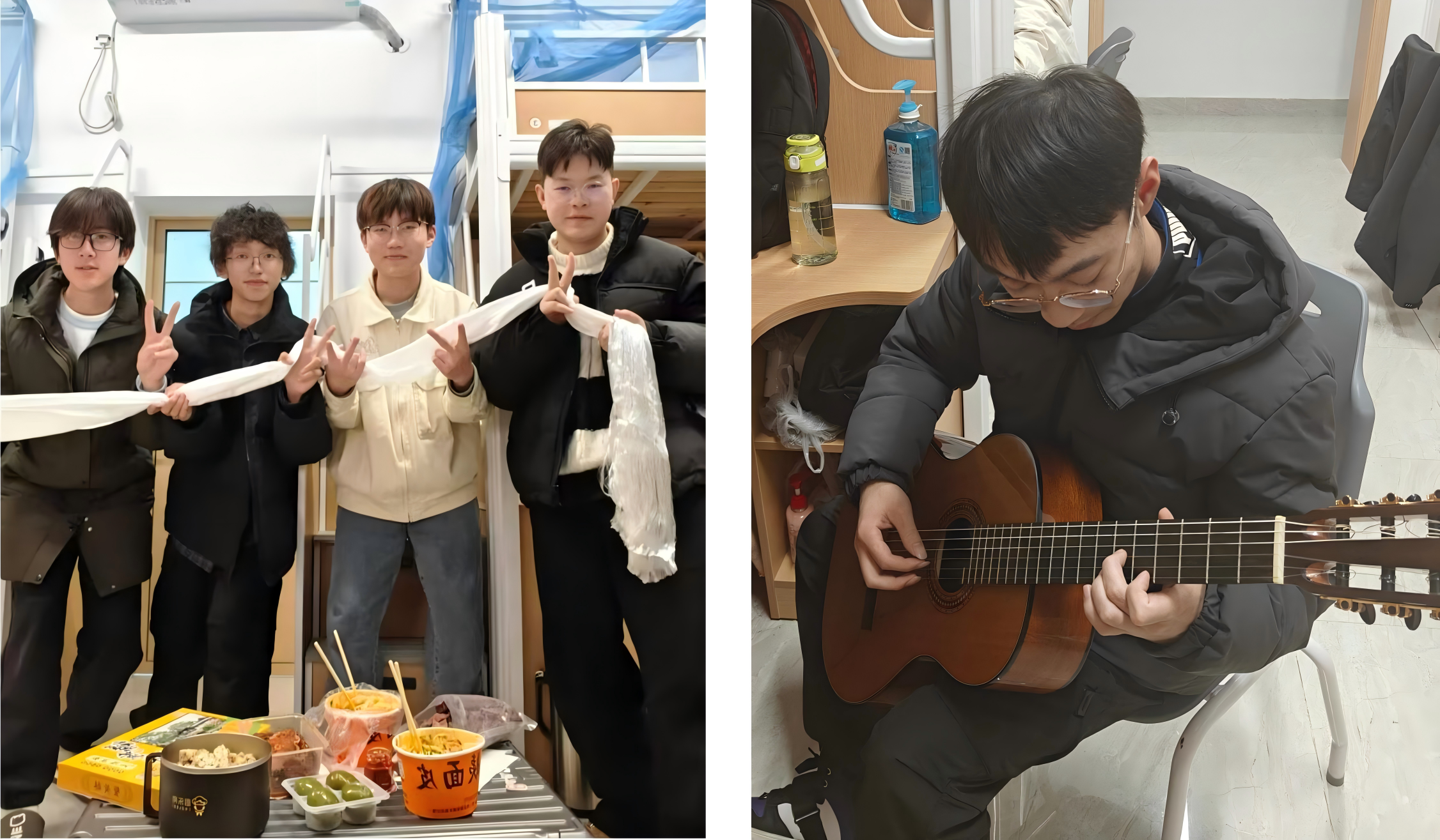共计有来自西藏、新疆、贵州、甘肃、湖北等十余个省份中上百种各具特色的美食,这些琳琅满目的特产,每一份都蕴含着同学间深厚的情谊,每一份都承载着独特的地域文化,每一份都饱含游子对家乡味的牵挂和回忆。同学们的分享不仅仅局限于美食,更有地域文化交流和个人才艺展示。杉苑519宿舍来自西藏的旦增索朗同学,为宿舍同学献上象征纯洁友谊的白色哈达,进一步增进了各民族同学间的真挚情感。508宿舍的李惟迅同学,通过吉他演奏的方式带来一首动听的歌曲,在歌声中传达了对家乡的思念和同学间温暖的情谊。