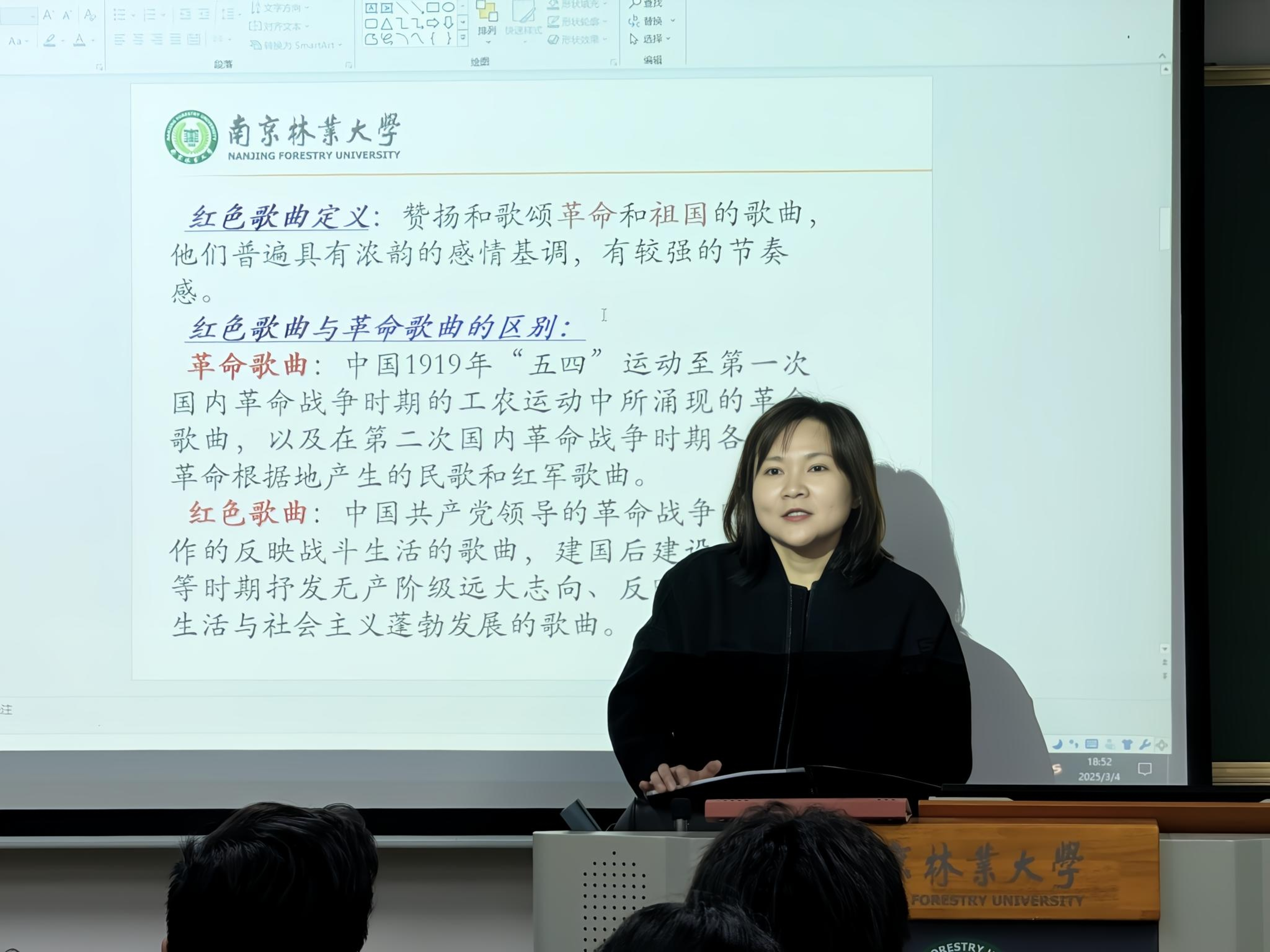 洪老师带领学生鉴赏了《我的祖国》《你是这样的人》《教我如何不想她》等多首红歌,最大程度地发挥了歌曲的感化、教育功能。现场同学沉浸在悠扬的歌声中,触摸着那一段段红色记忆,仿佛与历史中的青年进行了一场跨越时空的对话,感受着来自不同时代爱国精神的回响。