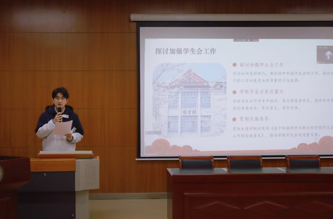 会议伊始,学生会秘书处部长余坤阳带领全体成员集体学习了《关于加强新时代新征程学联学生会工作的实施意见》文件精神。他详细介绍了文件的出台背景与发布意义,并结合实际从工作目标、重点任务到组织实施逐条研读,强调学生会工作人员要以身作则,自觉接受广大同学的监督,为同学谋利益,为组织谋发展。