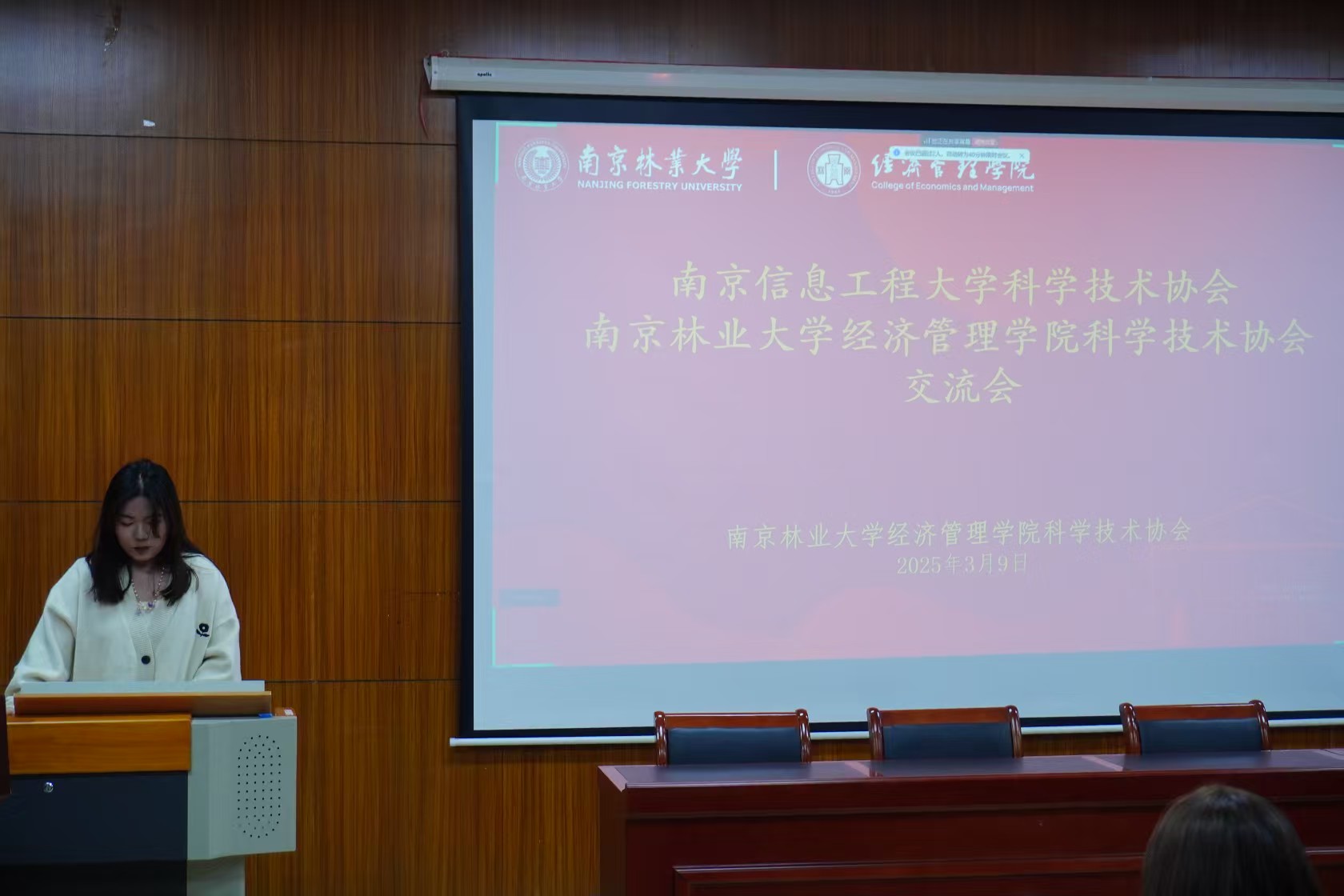 会议伊始,南林经管科协负责人李冰冰先对南信大同学们的到来表示欢迎。她系统介绍了协会的发展历程和部门职能,并着重介绍了近年来协会成功打造的“金融知识竞赛”等品牌活动,以“中国国际大学生创新大赛”“挑战杯”“大学生英语竞赛”“数学建模竞赛”等竞赛为抓手,锤炼学生科创“硬实力”。李冰冰表示:“我们始终以服务同学成长为核心,未来将进一步拓展校企合作,助力同学们科创成果落地。”