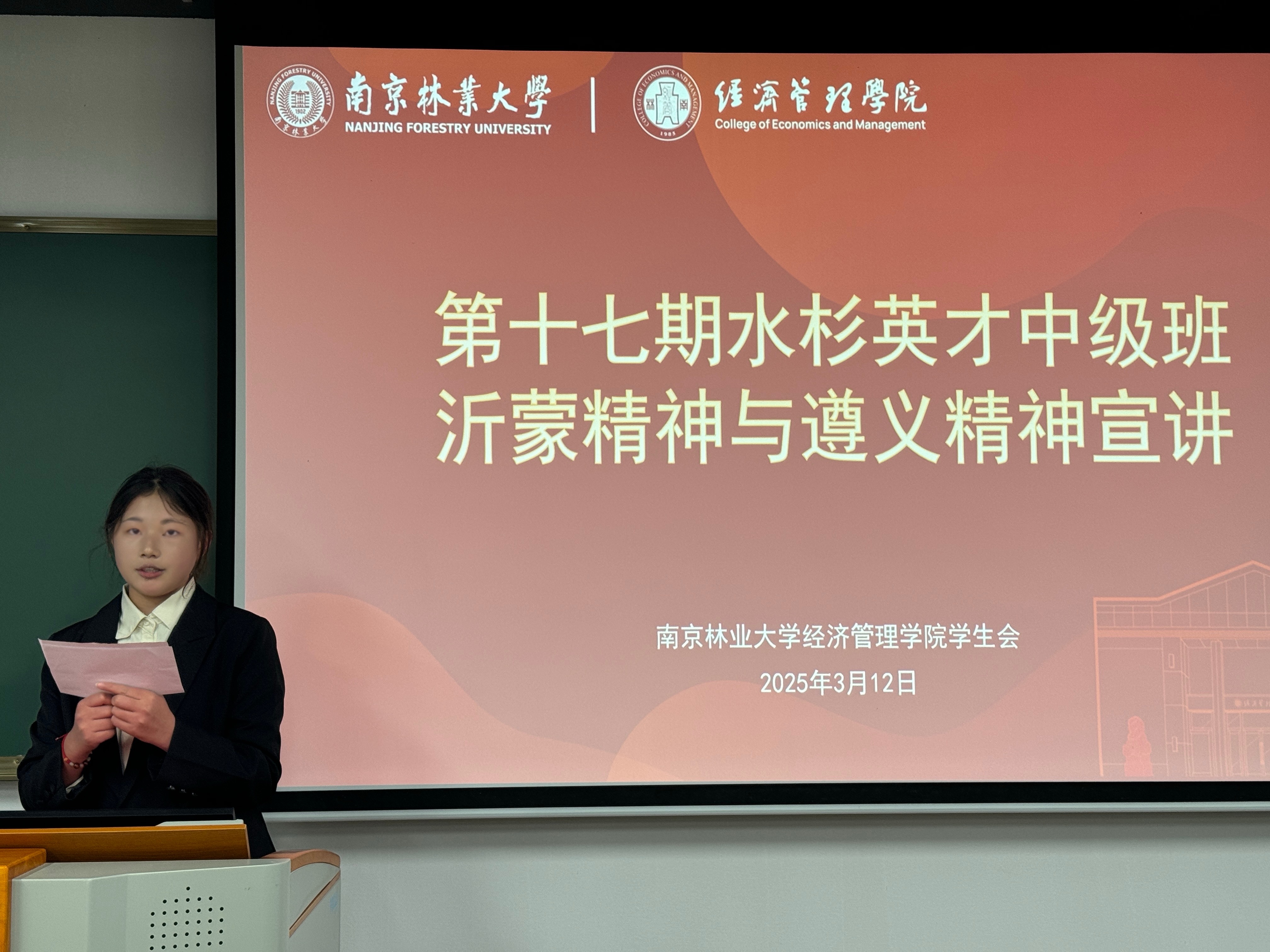 为深入学习贯彻党的二十大精神,大力弘扬以伟大建党精神为源头的中国共产党人精神谱系,3月12日,经济管理学院在白马校区3311教室举行水杉英才中级班红色精神讲座。此次讲座聚焦遵义精神和沂蒙精神,分别由22级学生张昊和23级学生孙佳佳主讲。