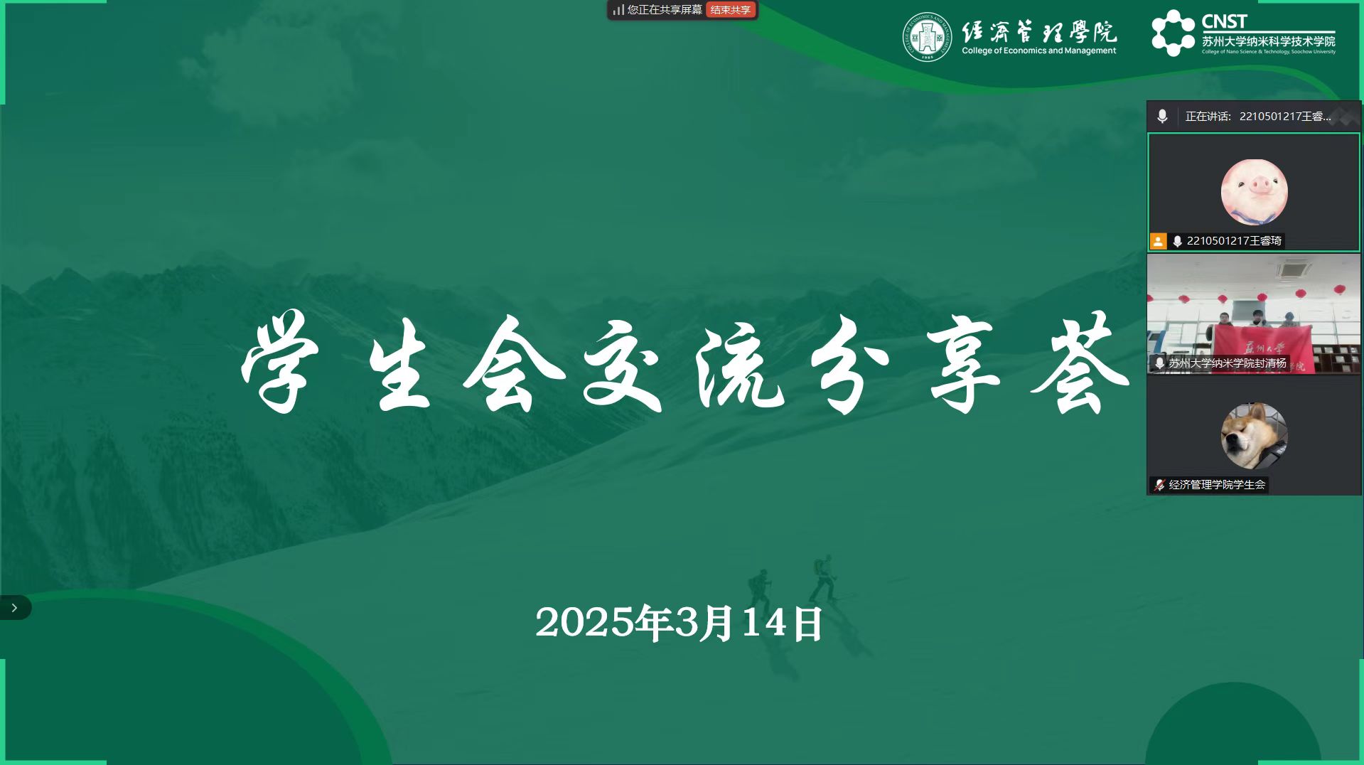 为深化校际学生会合作,提升学生组织服务效能,3月14日,南京林业大学经济管理学院学生会与苏州大学纳米科学技术学院学生会线上举办了主题为“经彩纷呈·纳才共进”的学生会工作交流分享会,会议由学院学生会主席团成员王睿琦主持。本次交流会通过经验分享、专题研讨、互动交流等形式,共话学生组织建设与创新发展。