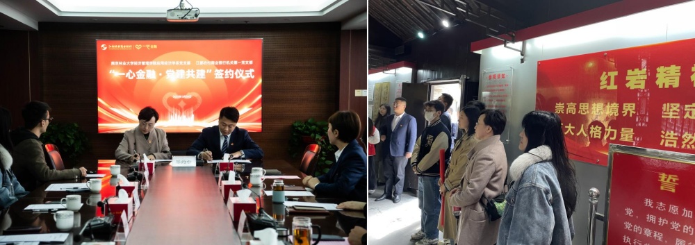 党的二十大报告明确指出:要“增强党组级政治功能和组织功能”,推动基层党组织建设与社会服务深度融合。为了贯彻落实新时代党的建设总要求、探索“党建引领、资源共享、双向赋能”新路径的重要实践,南京林业大学经济管理学院应用经济学系党支部与江都农村商业银行机关一支部共同决定开展党建共建工作,此次活动既是校企合作的深化拓展,更是理论与实践的同频共振。