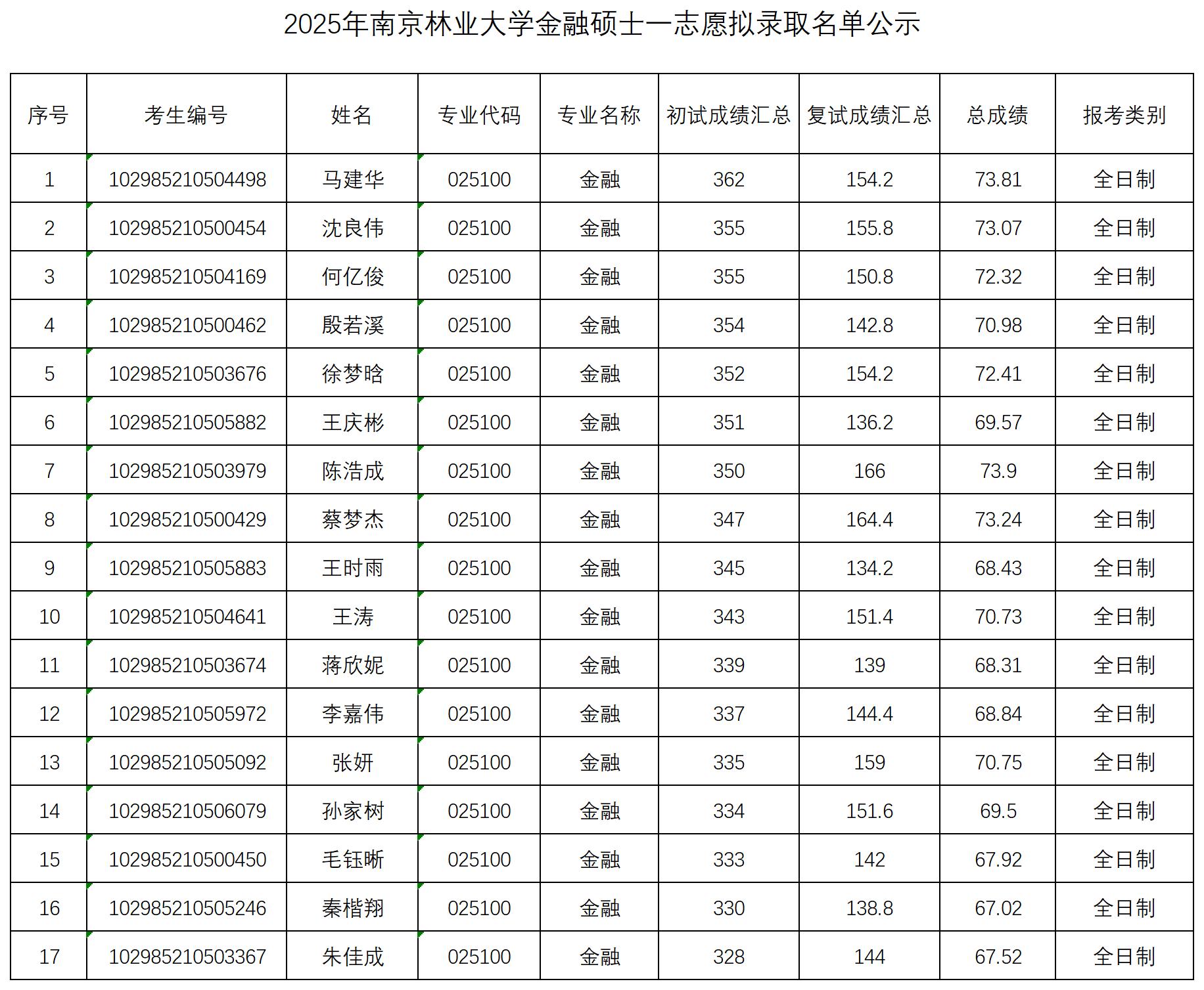 2025年南京林业大学金融硕士一志愿拟录取名单公示
