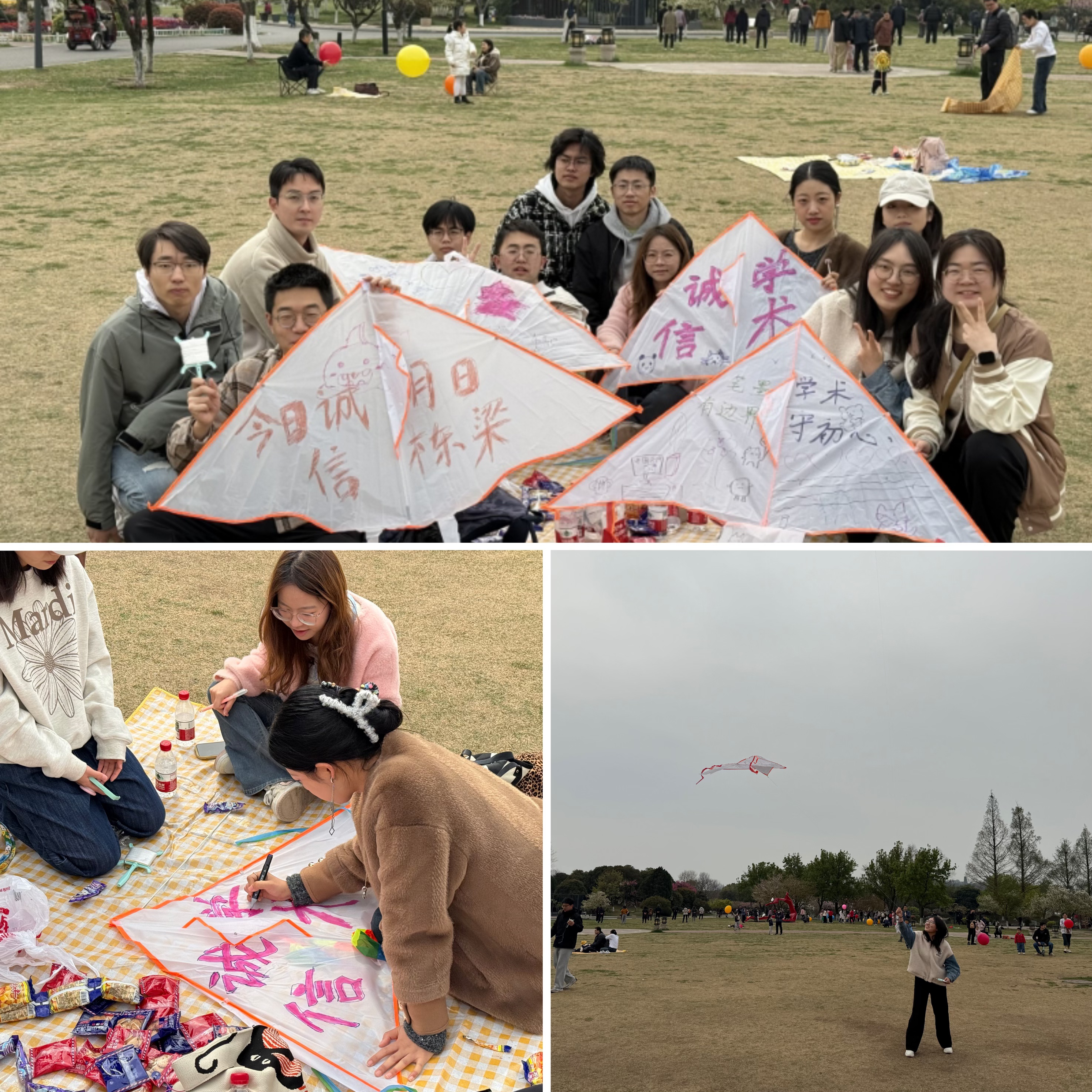 3月30日,学院在玄武湖开展“‘诚’风启航,‘信’达天下”活动。同学们三人一组,充分发挥个人创意和团队协作精神,在空白风筝上围绕科研诚信理念进行创作。创作完成后,同学们将风筝在指定区域内放飞。本次活动不仅缓解了同学们平时的学业压力,也展示了大家对学术诚信底线的坚守。