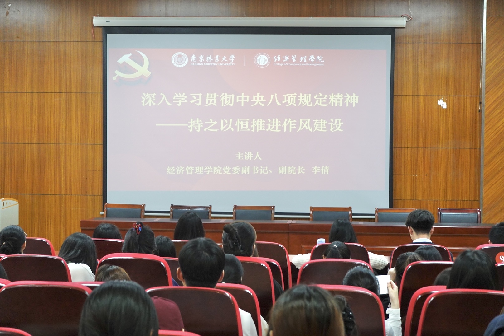 李倩从本次学习教育的背景出发,阐述了中央八项规定精神实质,说明了中央八项规定精神是新时代加强党的作风建设的重要遵循、是全面从严治党的切入口和动员令,深入贯彻中央八项规定精神是十分重要和必要的;强调了贯彻中央八项规定精神、加强作风建设要力戒和纠治“四风”问题,并进一步阐释了“四风”问题的具体表现和危害后果;并号召大家要树立正确的世界观、人生观、价值观,不断端正入党动机,补足精神“钙”,要自觉加强作风建设、密切联系群众、坚守艰苦奋斗的优良传统,以自身行动切实为师生办实事。最后,通过运用反面警示案例,开展以案说德、以案说纪、以案说责,强调无论是在日常生活,还是在学习科研中,学员们都要树立规矩意识、责任意识、榜样意识,模范遵守规章制度、行为规范和学术道德规范,展现新时代南林学子的良好精神风貌。