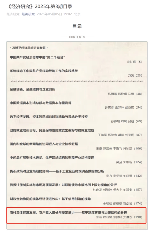 近日,我院青年教师张浩博士作为第一作者,与同济大学程名望教授、武汉大学张财经博士、浙江大学郑淋议副研究员合作撰写的学术论文《农村集体经济发展、农户收入增长与差距缩小——基于制度环境与治理结构的分析》,在《经济研究》2025年第3期发表。