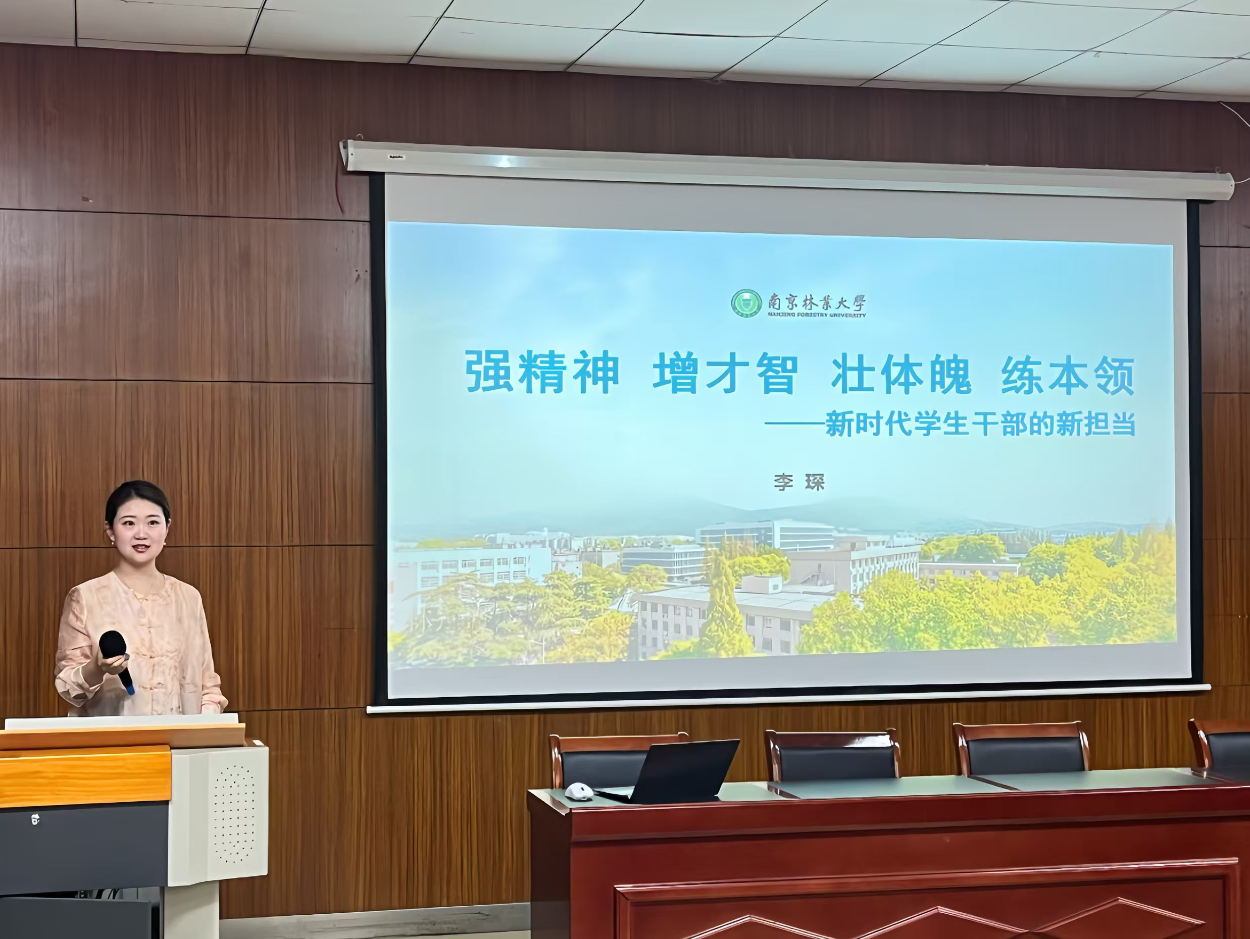 为贯彻落实习近平总书记关于青年工作的重要思想,培育选拔优秀共青团员,2025年5月14日下午,南京林业大学经济管理学院在新庄校区文科楼C105和白马校区3310同步开展入团积极分子培训工作。学生工作处思想政治教育科科长李琛老师以“新时代学生干部的新担当”为题,为全体学员带来一堂生动的主题培训。此次培训工作由学院团委书记赵淑颖老师主持。