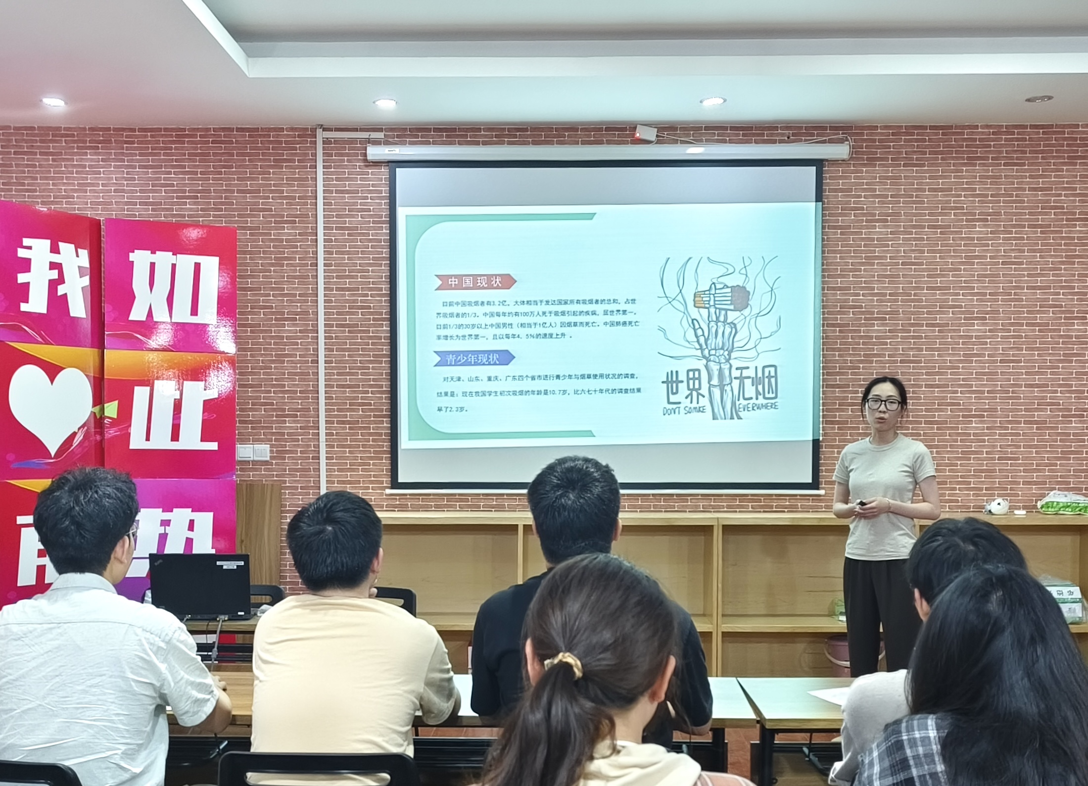 为进一步提升学生对烟草危害的认知,筑牢校园安全防线,5月14日,在第38个世界无烟日到来之际,我院生活权益中心在B138教室开展“指尖无烟,健康相伴”禁烟宣传活动,通过互动式体验+沉浸式科普的方式,引导青年学子树立青年学子树立科学健康的生活理念。本次活动由生活权益中心指导老师刘思静担任主讲人。