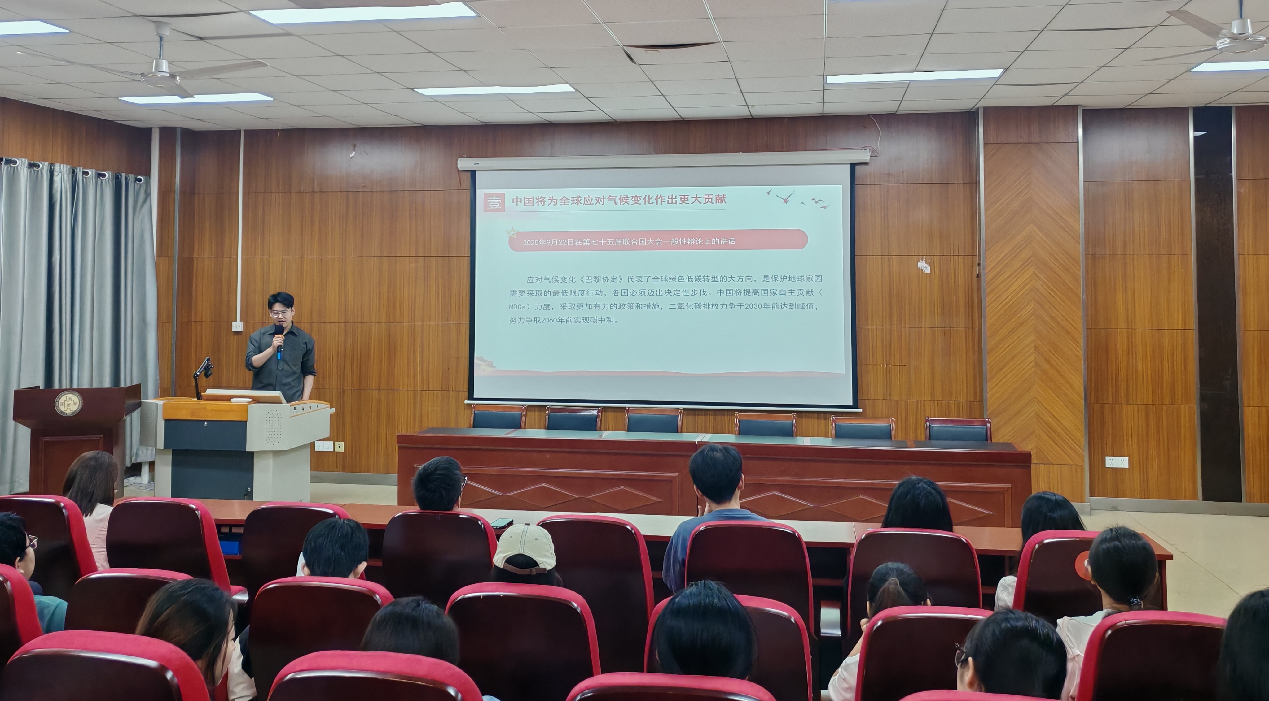 活动第一部分“学”,由张庆勇副教授带领全体参会人员重温习近平总书记关于“双碳”理论的重要论述,张庆勇副教授以《“碳达峰、碳中和”与全球气候变化》为题讲授专题党课,深入剖析了“双碳”目标与全球气候治理的联动性,并结合我国经济、能源、社会、环境等方面的基本国情,对习近平总书记关于“双碳”的重要论述进行了具体且系统的阐释,加深了与会师生对“双碳”理论的重要认识。最后,他呼吁师生立足学科交叉优势,在绿色技术创新、碳足迹核算等领域深化研究,为构建“政府主导、市场驱动、公众参与”碳治理体系贡献智慧。