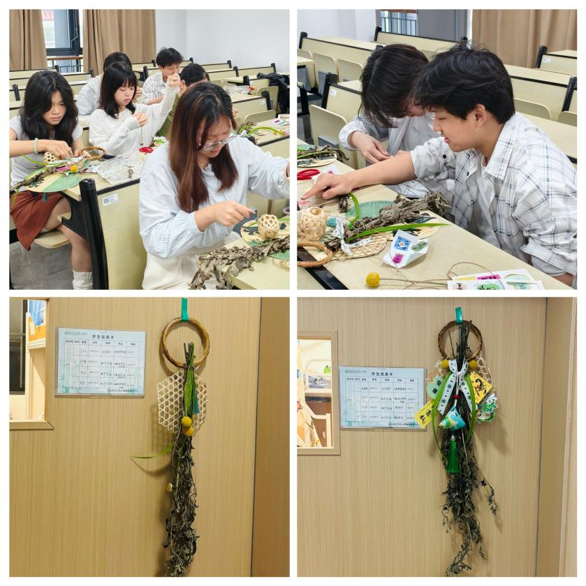 在动手制作环节,刘老师首先进行示范。随即,同学们纷纷动手创作,修剪叶片、缀铃铛、挂卡片……大家全神贯注,指尖舞动,将本草的自然芳香与美好寓意巧妙交织。在基础门饰框架上,同学们又融入个人巧思,将简单的香草枝叶转化为一件件独具匠心的门饰。教室里弥漫着艾草和菖蒲的清香,更洋溢着专注创造的热情。