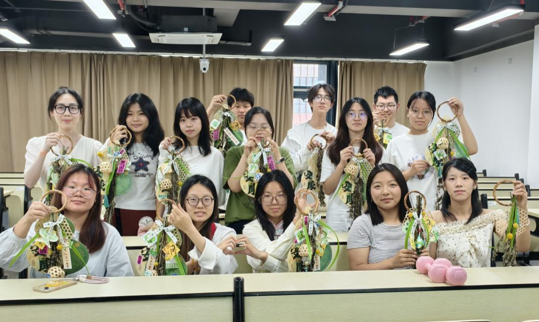 活动尾声,同学们满怀喜悦地与自己精心制作的门饰合影留念,刘老师肯定了同学们的专注投入与创意巧思,并寄语大家:“‘巧手结芳草’不仅是指尖的技艺,更是心间的修行。希望这些门饰可以成为守护宿舍安康、滋养同窗情谊的暖心印记。”