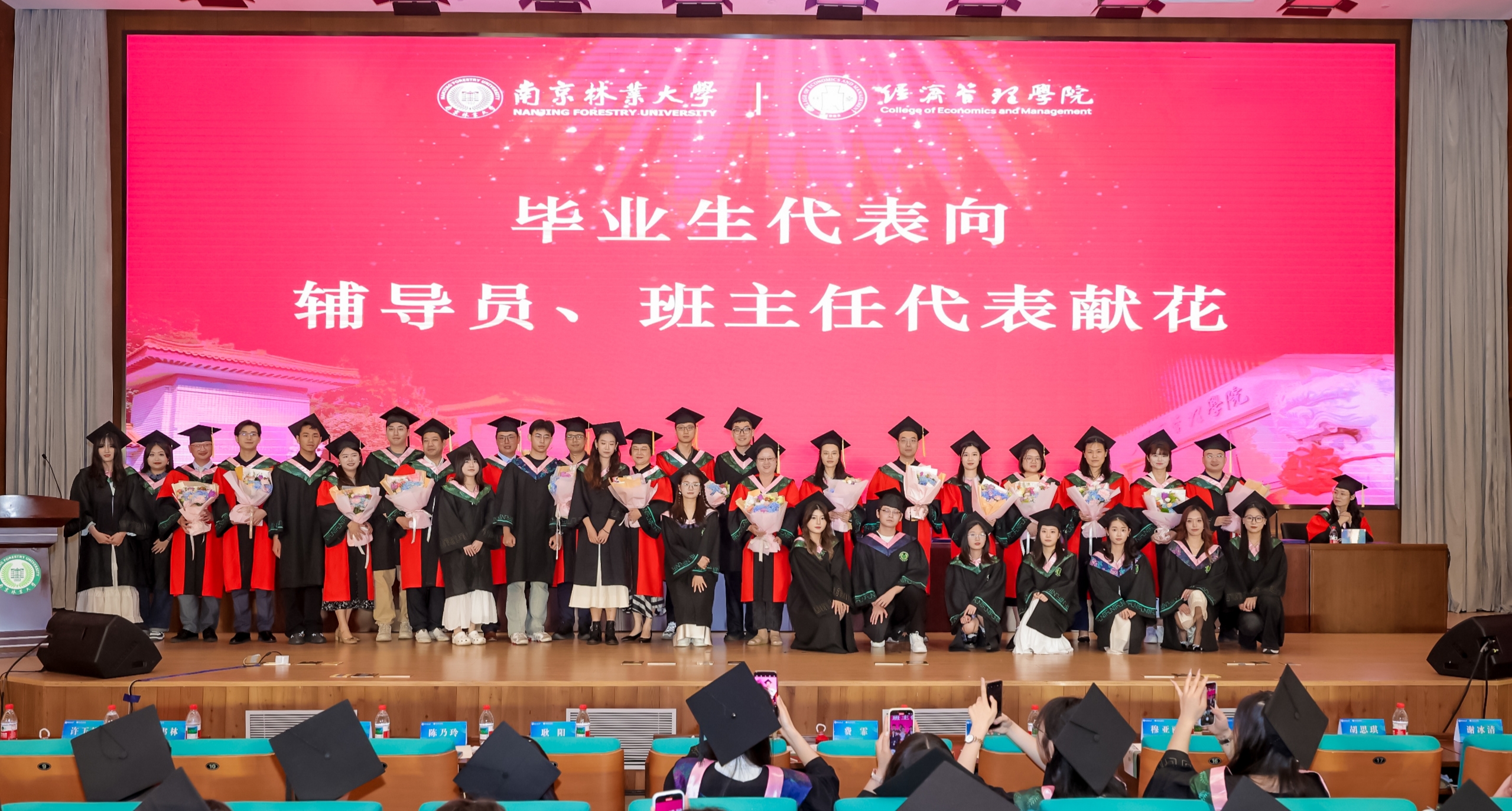 教师及班主任代表陈书林老师进行发言,他勉励毕业生保持终身学习习惯、坚定理想信念、常怀感恩之心,期盼同学们带着南林人的绿色基因,在未来各自领域绽放光彩。