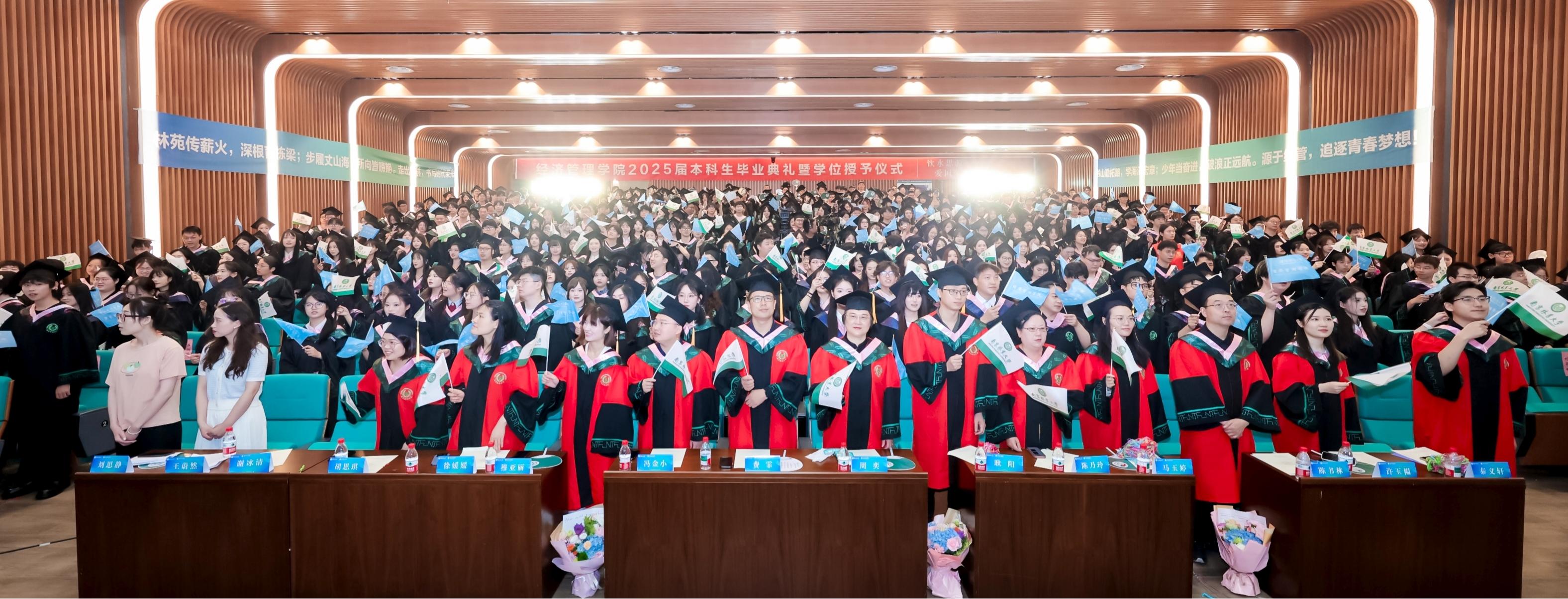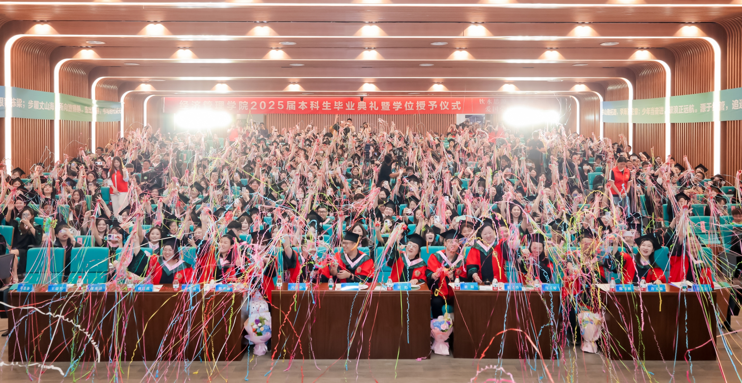 典礼在校歌声中落幕,希望经济管理学院2025届毕业生们在投身时代洪流中锚定个人坐标,将“诚朴雄伟 树木树人”的校训精神深植于心,在服务国家战略、回应民生关切中彰显经管智慧与担当,在数字经济、AI技术浪潮中勇立潮头,在绿色发展征程中书写华章。“少年当奋进,破浪正远航。步履丈山海,所向皆晴朗”,祝愿大家于时代画卷绘就精彩,于人生舞台绽放光芒,一路向阳高歌,前程熠熠生光!