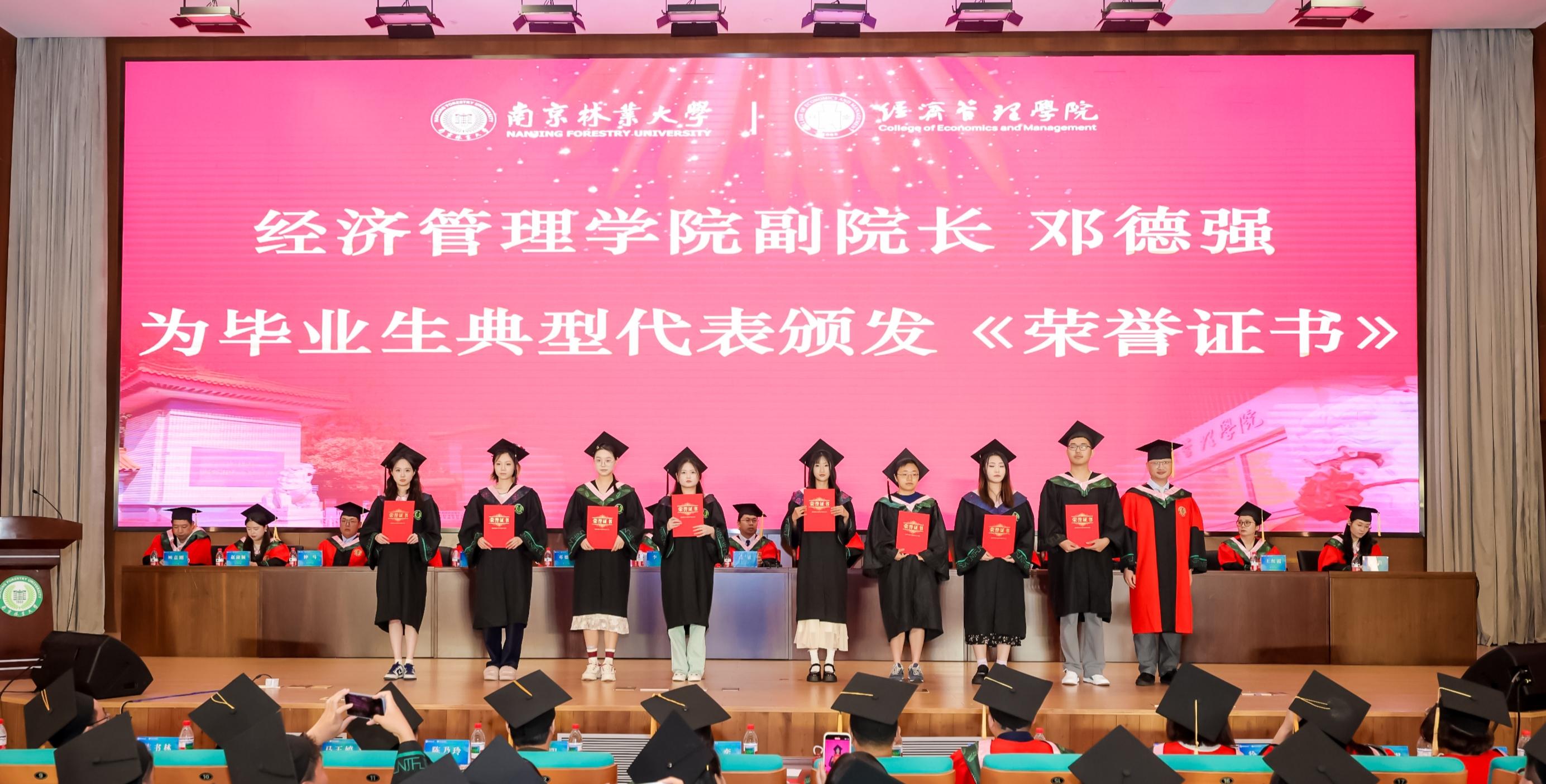 典礼在国歌声中拉开序幕。经济管理学院院长杨红强首先致辞,他代表学院向圆满完成学业的毕业生表示热烈祝贺和诚挚祝福,向辛勤付出的老师和家长致以崇高敬意和衷心感谢。面对即将启程的学子,杨红强提出四点期许:一是以“远大理想”锚定人生坐标,做时代发展的答卷人,将个人理想融入民族复兴的洪流;二是以“绿色思维”引领创新实践,做生态文明的建设者,让生态文明之花在创新实践中绚丽绽放;三是以“创新能力”拥抱技术浪潮,做产业革命的破局者,锻造核心竞争力,成为引领未来产业变革的复合型人才;四是以“赤子之心”接纳生活百态,做温暖世界的追光者,永远保持对生活的热爱,对世界的善意和对未知的好奇。他勉励毕业生无畏前行,用拼搏铸就未来,用奋斗书写辉煌,并表示学院永远向大家敞开怀抱,期待未来仍能与同学们分享喜悦。