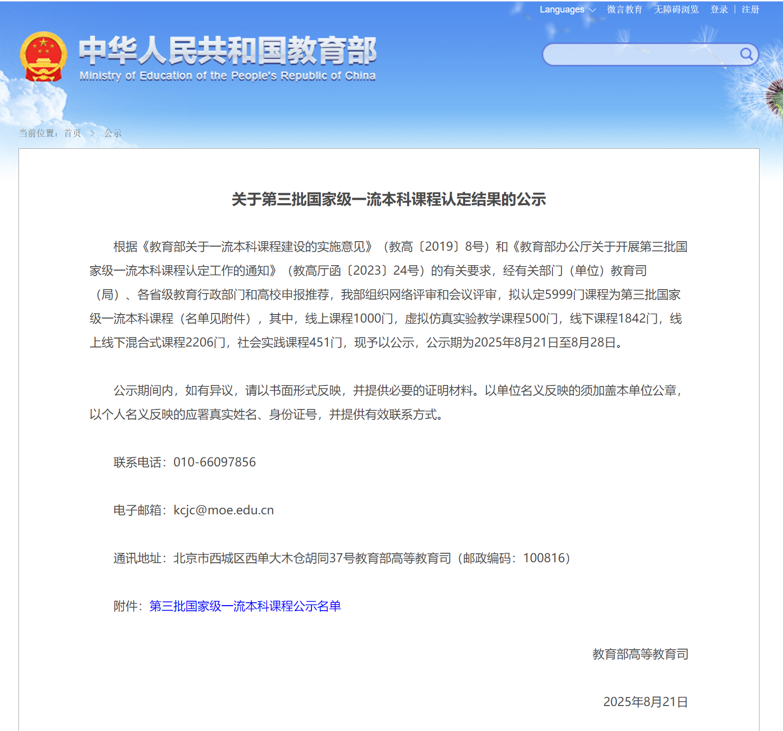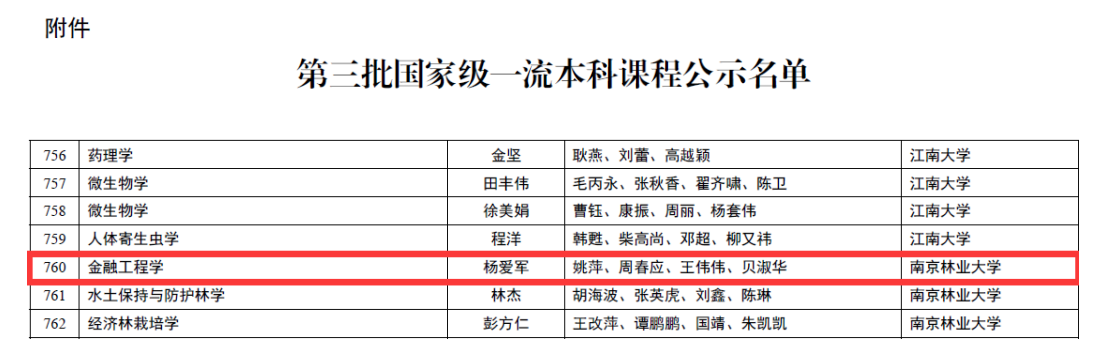 近日,教育部发布了《关于第三批国家级一流本科课程认定结果的公示》,我院杨爱军老师负责申报的《金融工程学》课程获批国家级线下一流本科课程。此次获批国家级一流本科课程,是我院在国家一流课程建设方面取得的又一突破。