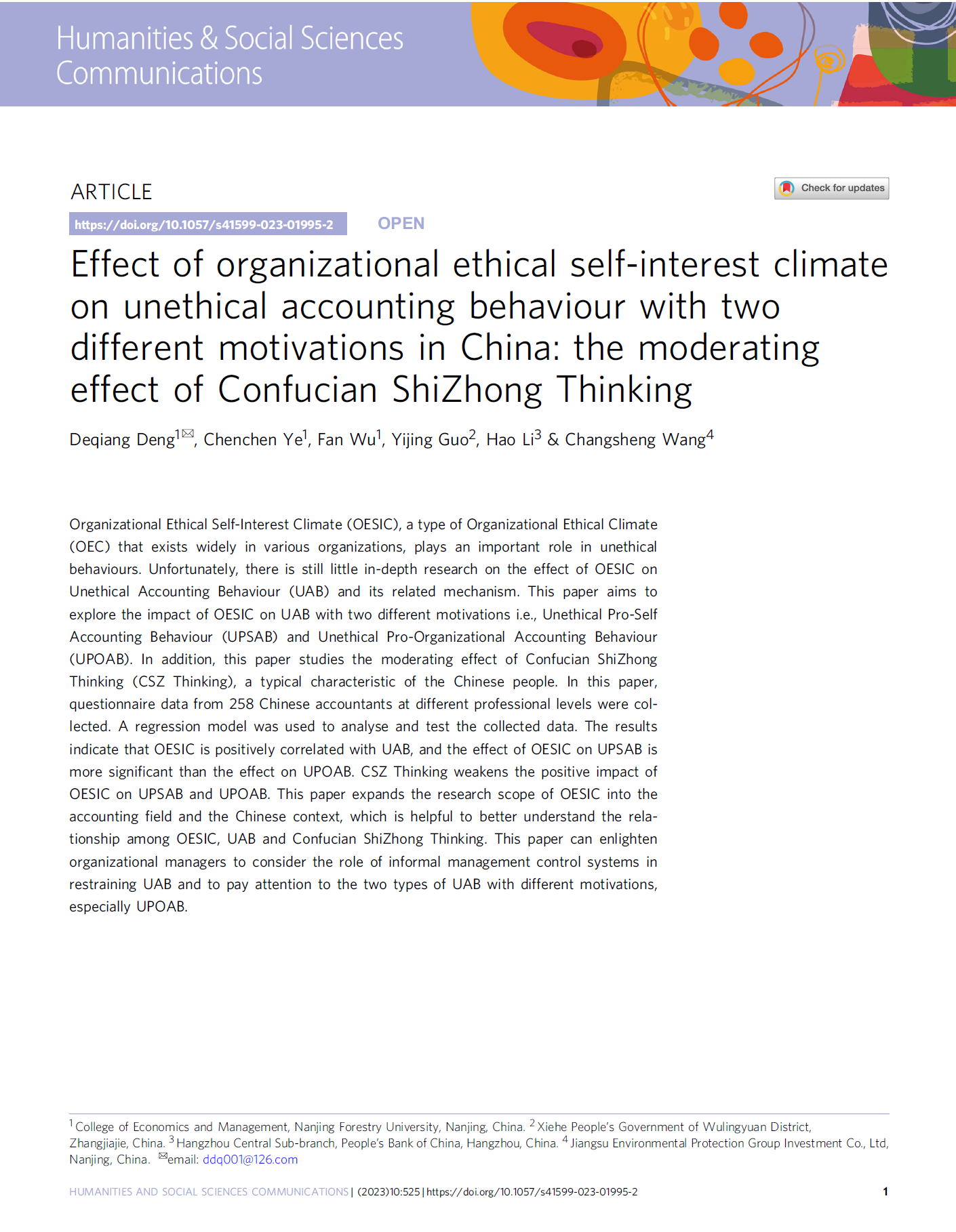 近日,我院邓德强教授作为第一和通讯作者在Nature子刊Humanities and Social Sciences Communications上发表了题为《Effect of organizational ethical self-interest climate on unethical accounting behaviour with two different motivations in China: the moderating effect of Confucian ShiZhong Thinking》的论文。