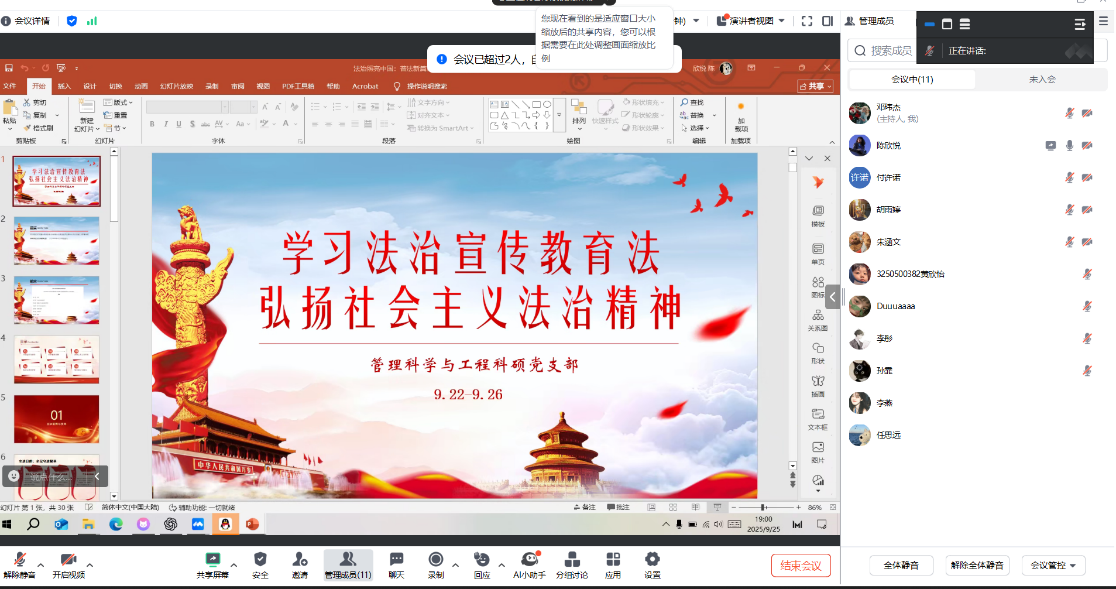 各党支部紧扣“学习法治宣传教育法,弘扬社会主义法治精神”主题,结合实际,通过开展主题党课、学习研讨会等形式,线上借助腾讯会议、教育部全国青少年普法平台等开展学习,打破时空限制,确保班级、支部成员全员参与;线下通过主题班会、团日活动、专题党课、党日活动、学习研讨会、法治观影及专题讨论等形式,深化学习效果。其中,学生农林经济管理党支部不局限于理论学习,不断通过研讨引导党员思考如何将法治精神落实到具体工作中,达成“以学促干”的目的,在支部内营造了办事依法、遇事找法、解决问题用法、化解矛盾靠法的良好法治氛围;管理科学与工程科硕党支部认真搜集资料、制作PPT,以专题宣讲为主要形式,辅以法条精读、要点解析、案例研讨、互动交流等环节,内容紧密围绕《法治宣传教育法》展开,并深入阐释其与弘扬社会主义法治精神的内在联系,多元且递进的学习形式有效提升了党员对法治宣传教育的认知和对社会主义法治精神的感悟;博士党支部则组织党员通过教育部全国青少年普法平台学习法治课程,借助“互联网+普法”资源,结合科研、生活实际深入研讨法律问题,将资源整合通过网络分享,方便党员利用碎片化时间反复学习,充分利用“口袋里的法治课堂”这一类学习资源,有效拓展法治学习的时空边界与参与广度;学生会计一党支部组织党员观影《第二十条》并专题讨论,将法治教育与会计专业结合,深化党员对法治精神的理解,增强法治和职业道德观念,未来还将完善机制、深化融合,引导党员严守会计法律底线。其他支部则围绕法律讲解,案例解析等方面,通过小组研讨,视频学习等方式,对法律法规进行了深度学习,法治意识的种子悄然生根发芽。通过这次学习,各支部既提升法律素养,又传递法治理念,筑牢尊法学法守法用法根基。